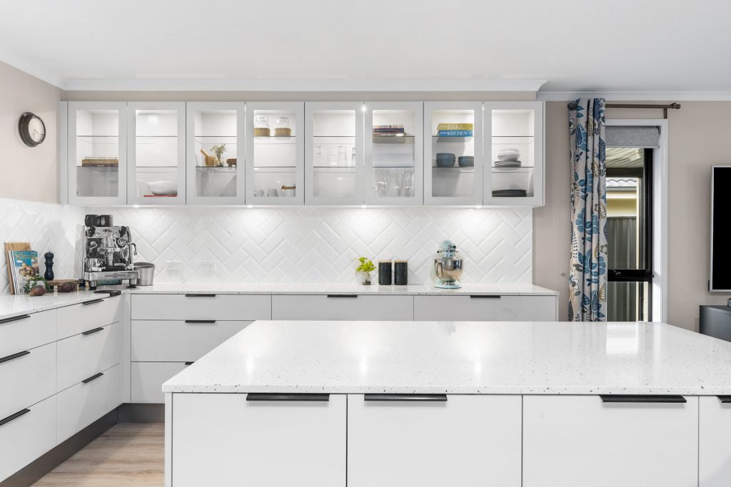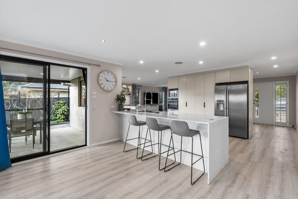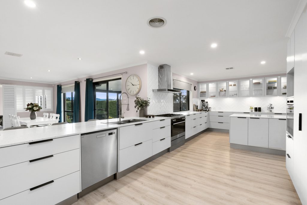 – Huge chef’s kitchen with quality appliances, stone benchtops, plumbing connections for commercial coffee machine and water/ice refrigerator, and ample cupboard and bench spaces
