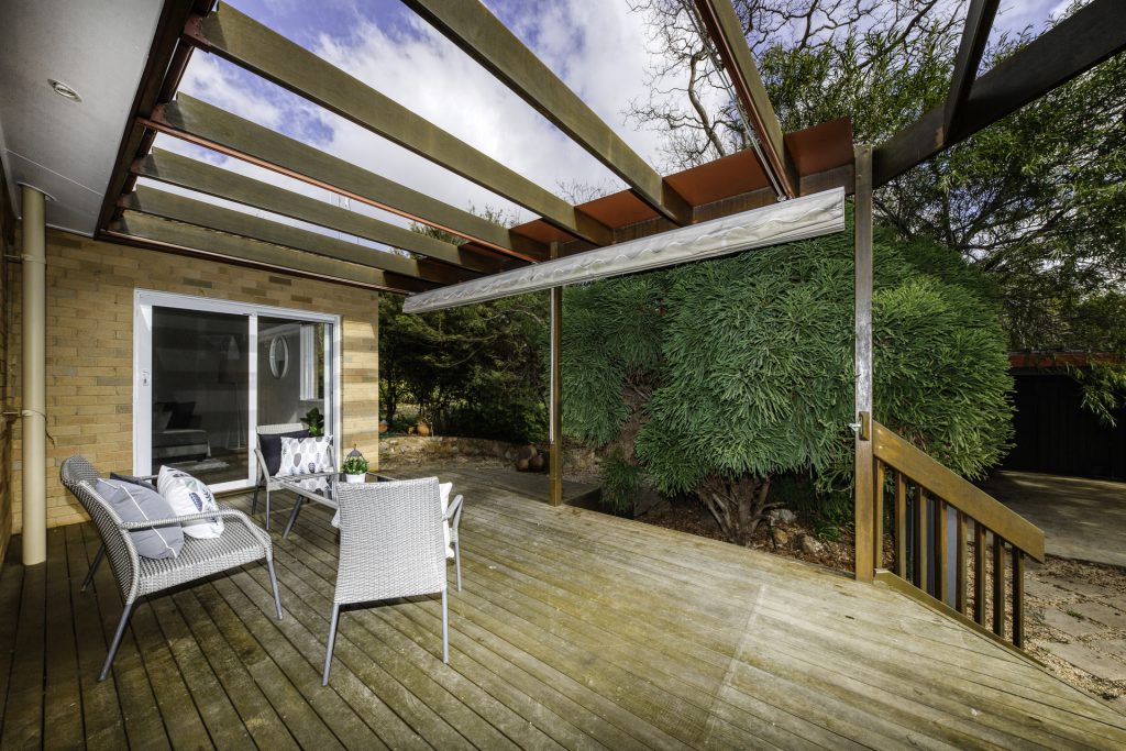 Deck with hardwood pergola and retractable awning