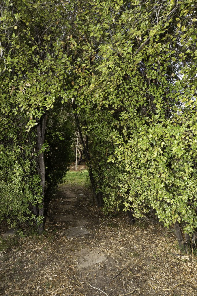 Clothesline and vegetable garden screened by shrubs