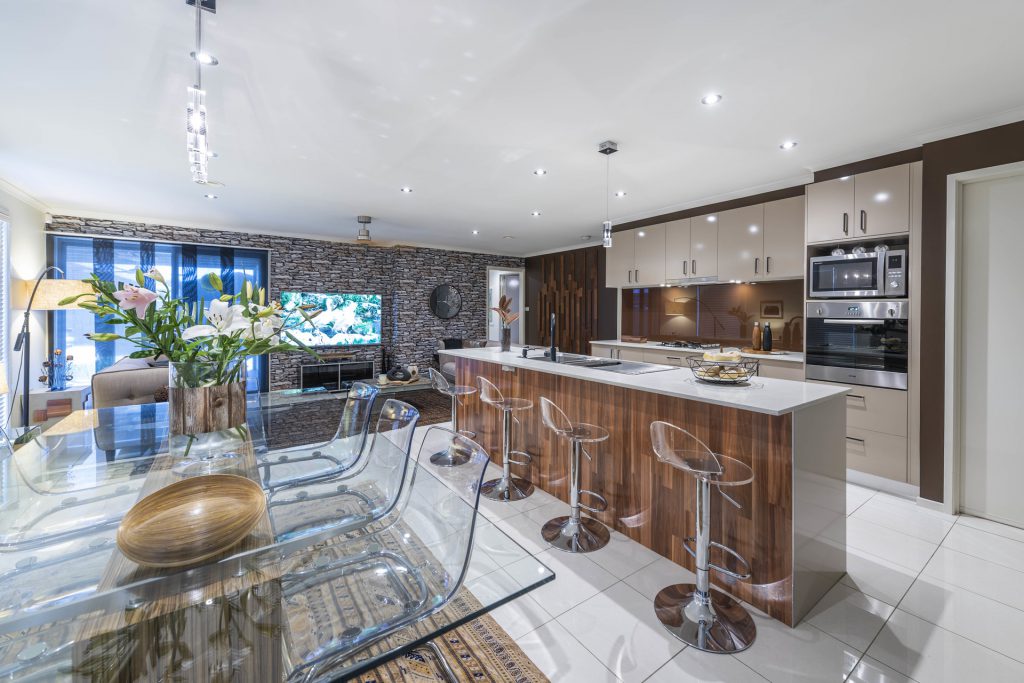 Inside the property is no different, the stone and wood design elements create a level of opulence not often seen. In addition, the large open plan kitchen has an enormous island, stone benchtops and high end appliances and is guaranteed to be an entertainer’s delight. It also provides a focal point for the large open plan dining and living areas, which link to the covered outdoor patio.