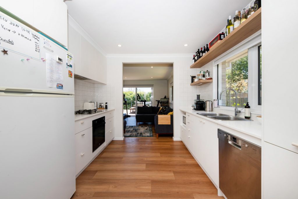 The spacious open plan lounge & dining room creates an ideal entertaining space, with elegant timber look floors connecting it to the rest of the home while the large double glazed windows allow immense natural light. The open plan design of the family room and kitchen is perfect for day-to-day living, with a magnificent north-facing space that extends out on to the immense alfresco deck, an ideal space for entertaining with family & friends while taking in the Brindabella’s. The modern galley style kitchen is well appointed with stainless steel appliances, stone benchtops, tiled splashback and gas cooking.
