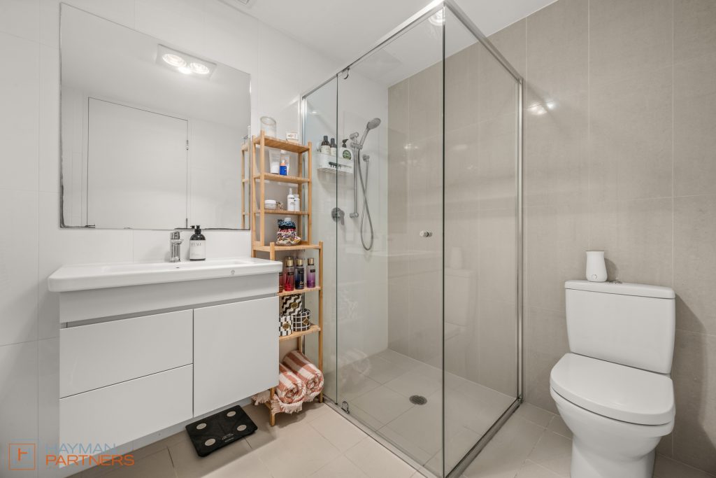 The bathroom showcases an oversized shower, floor-to-ceiling tiles, a custom vanity, and high-quality tapware, reflecting the consistent attention to detail throughout. Thoughtfully designed storage solutions are integrated into the apartment, including built-in wardrobes, offering both functionality and style.