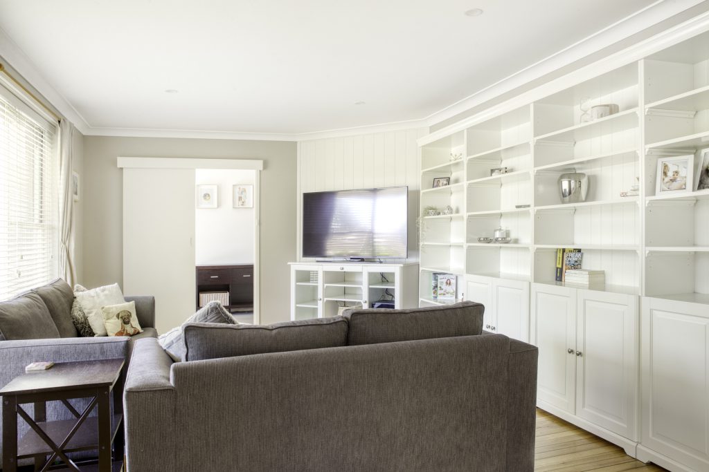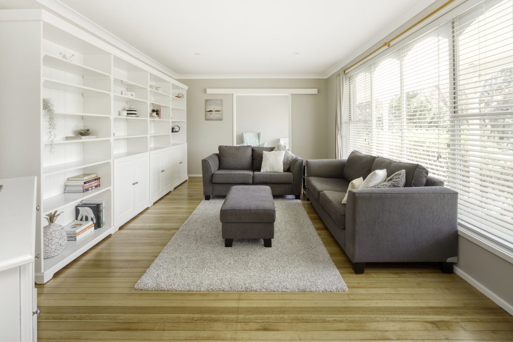 Spacious lounge area with leafy outlook & polished hardwood floors