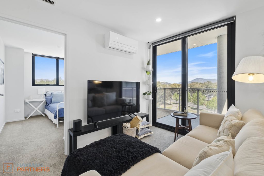 Take in the breathtaking, unobstructed views of the Brindabellas from the apartment. Each bedroom enjoys views of greenery, adding to the calm and tranquil atmosphere of the home. Air conditioning units in the main bedroom and living area allow for tailored climate control, while the apartment’s sunny aspect and natural airflow help to minimize energy use, keeping the home pleasant in all seasons.