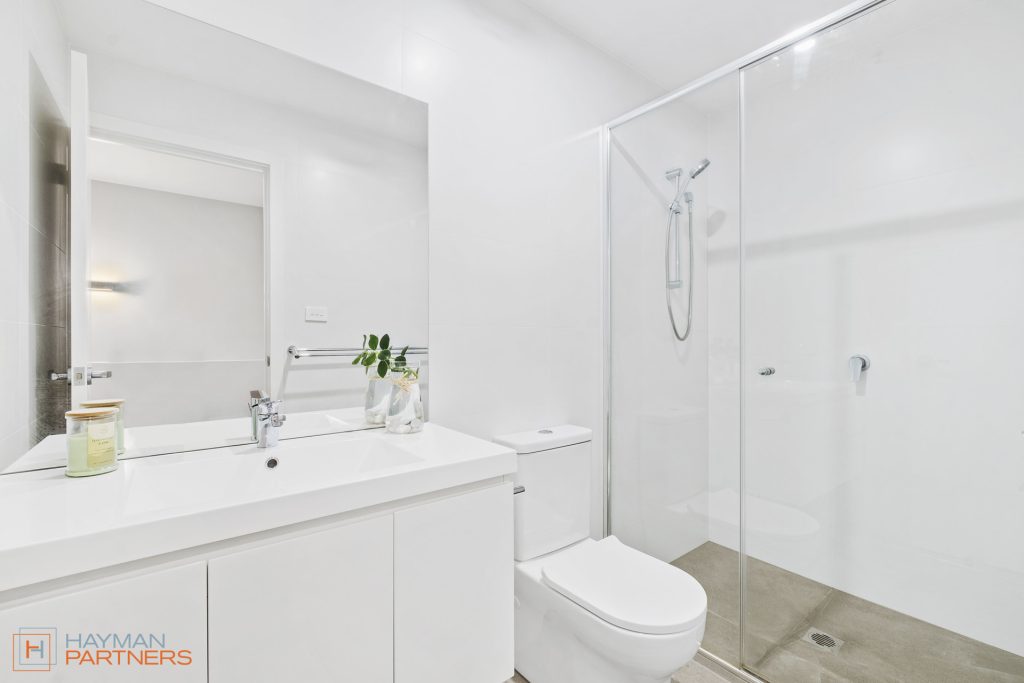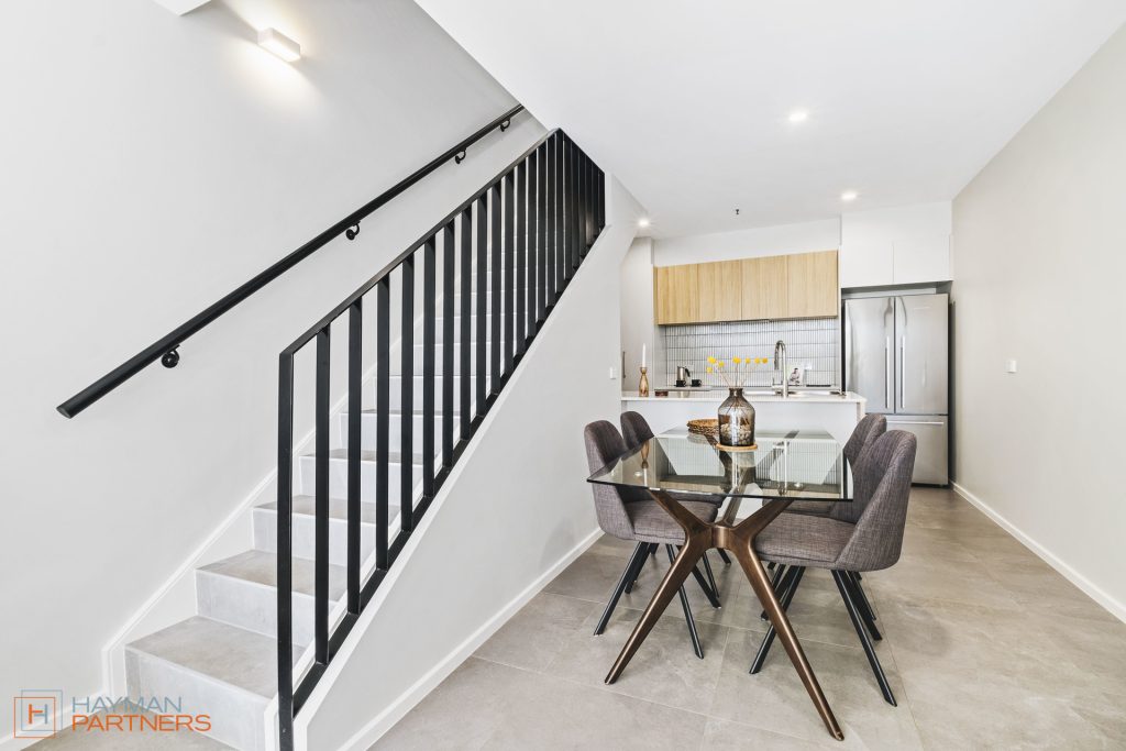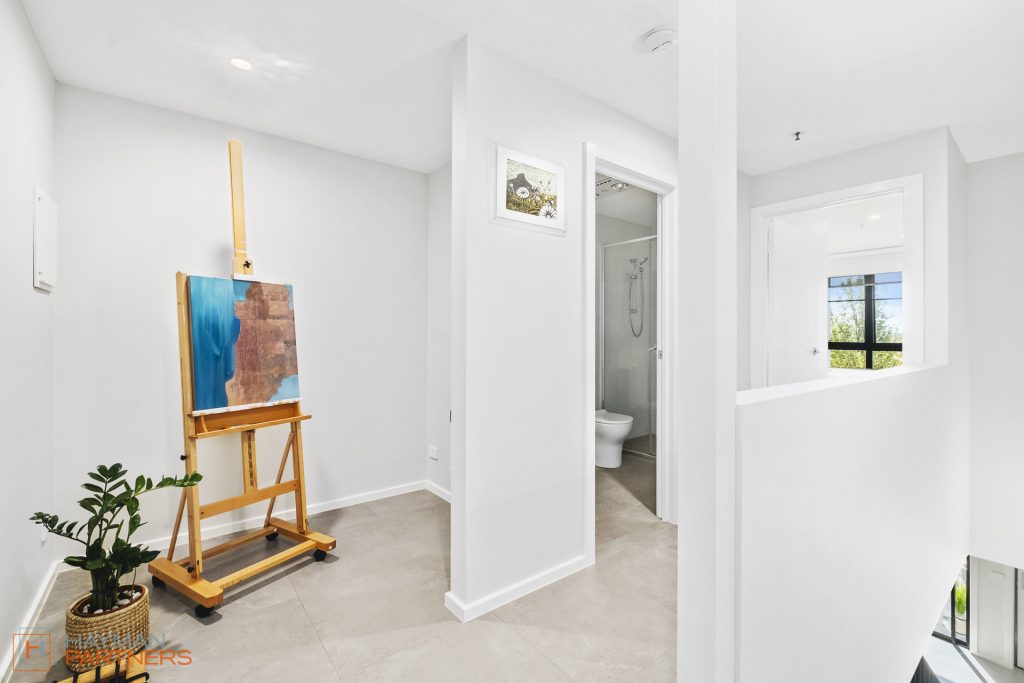 Moving upstairs along the exposed railing staircase, you’ll find a spacious bathroom with floor to ceiling tiles and an oversized shower, along with an air-conditioned master suite that includes a built in robe. An open plan workspace offers a welcome solution for those who work from home or study, with convenient separation from living and relaxation spaces.