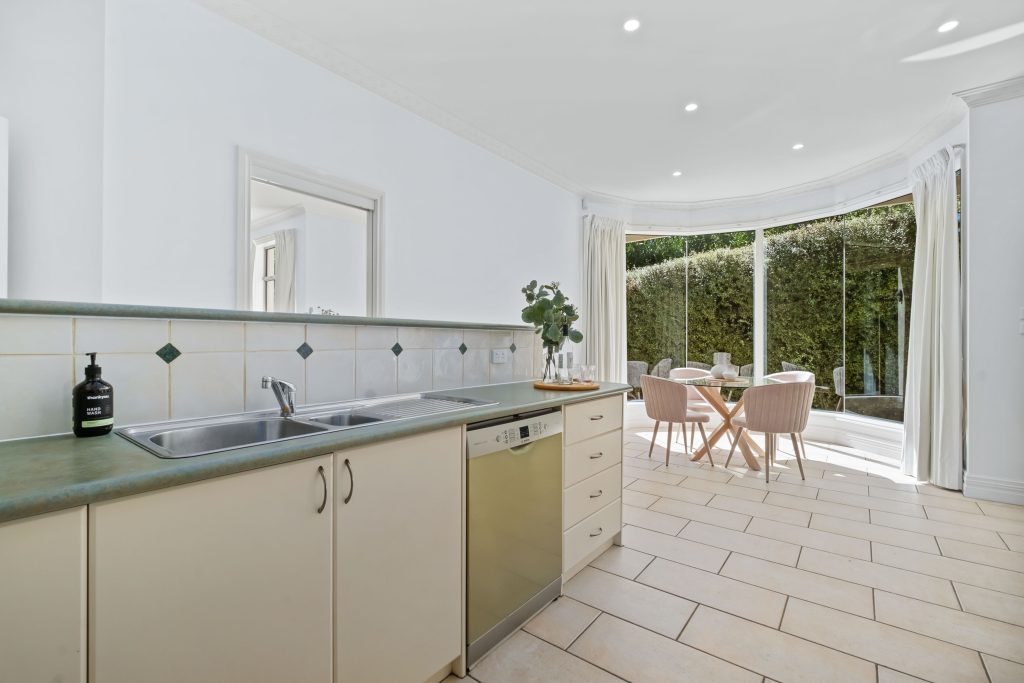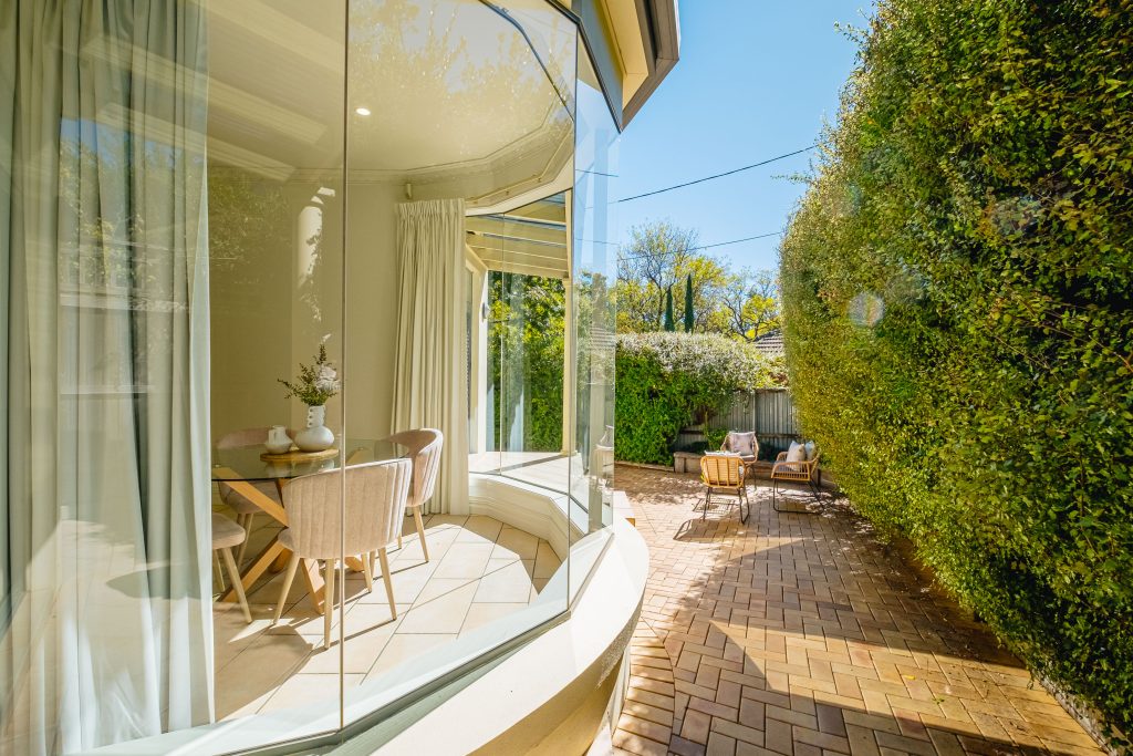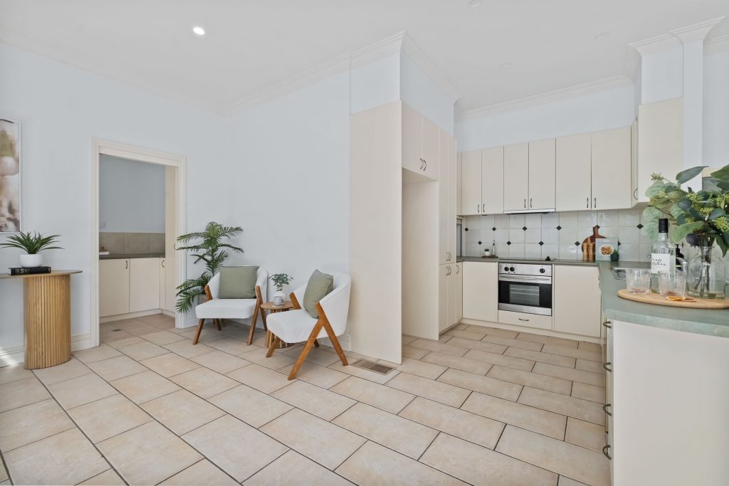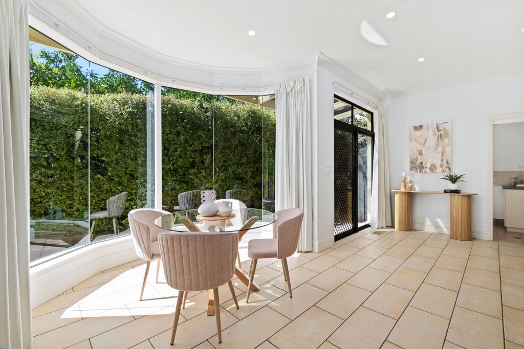High ceilings, ornate cornices, and deep skirting boards add character throughout, enhancing the formal open-plan living and dining area. A second open-plan space integrates the kitchen, casual meals, and sitting area, with a stunning full-height glass bay window that bathes the space in natural light.