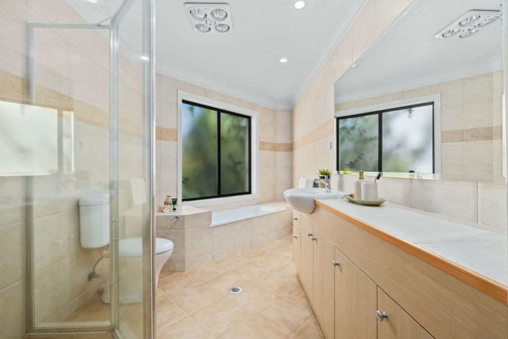 The generous master suite is a private retreat, complete with a walk-in robe and ensuite featuring both a bath and shower. Two additional bedrooms with built-in robes share a well-appointed family bathroom with a bath, shower, and separate toilet.