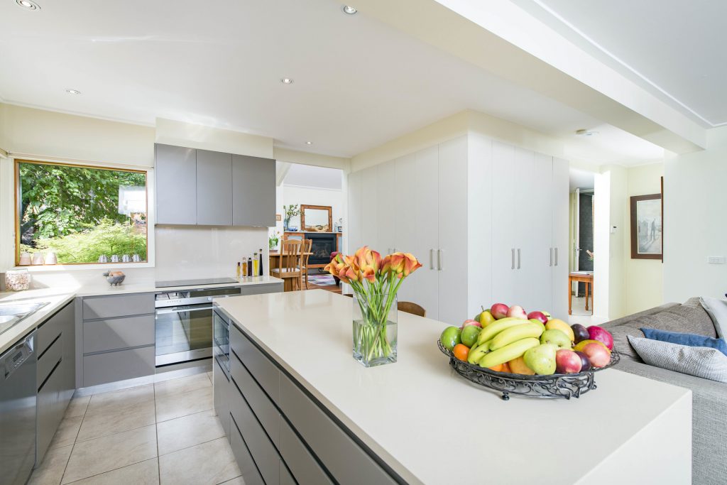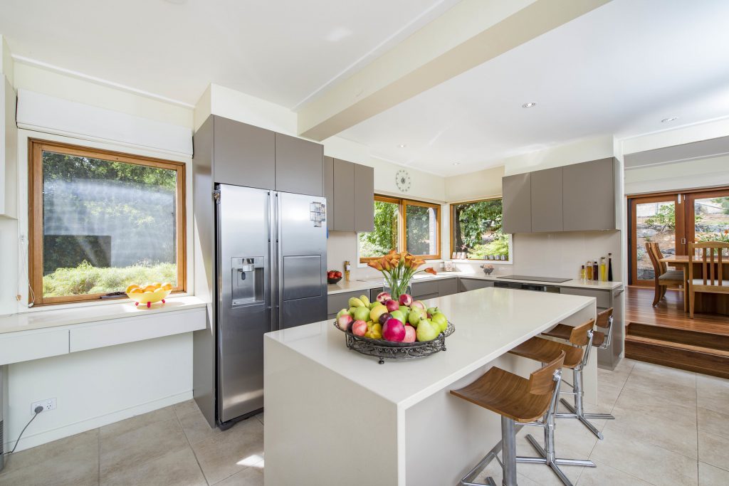 kitchen with waterfall edge stone breakfast bar & bench tops