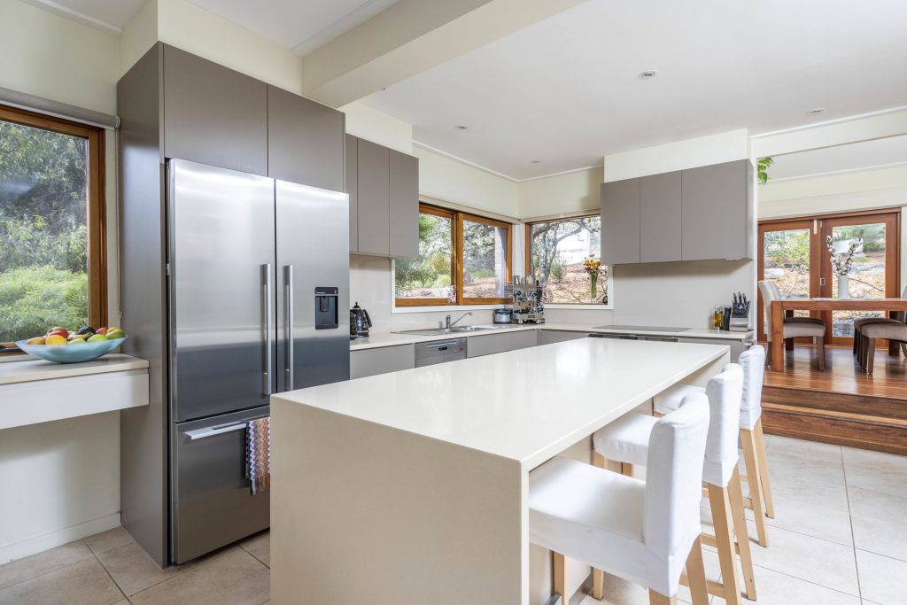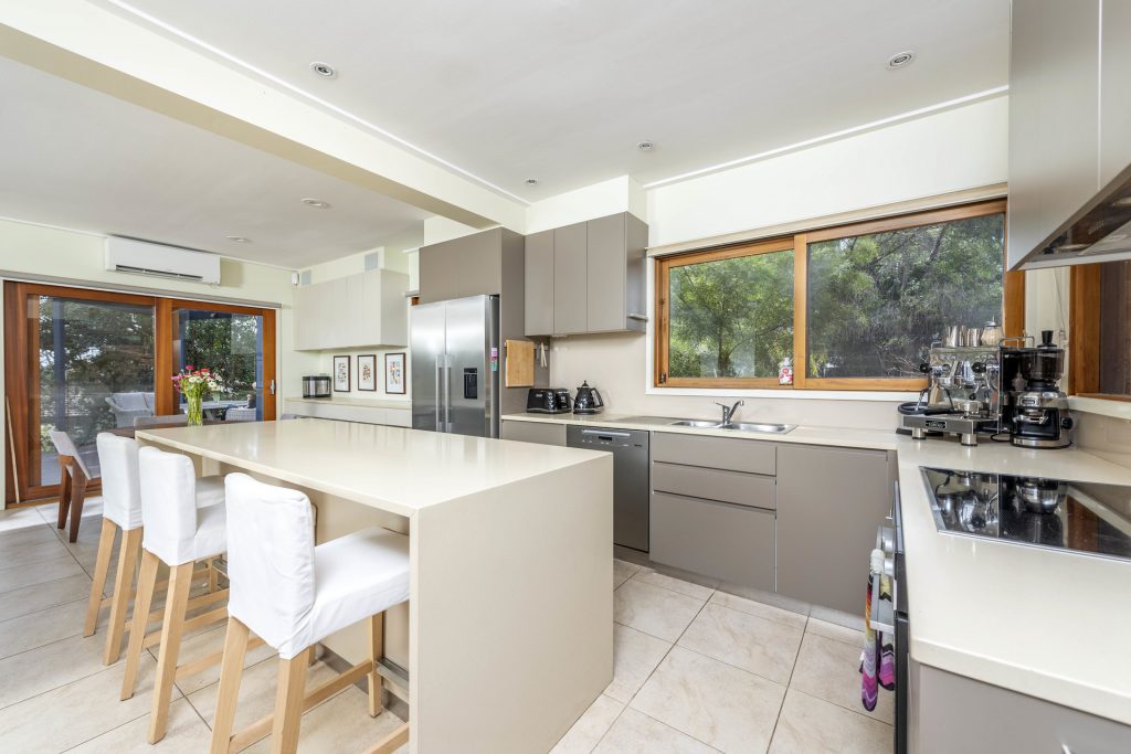 Kitchen with waterfall edge stone breakfast bar & bench tops.
