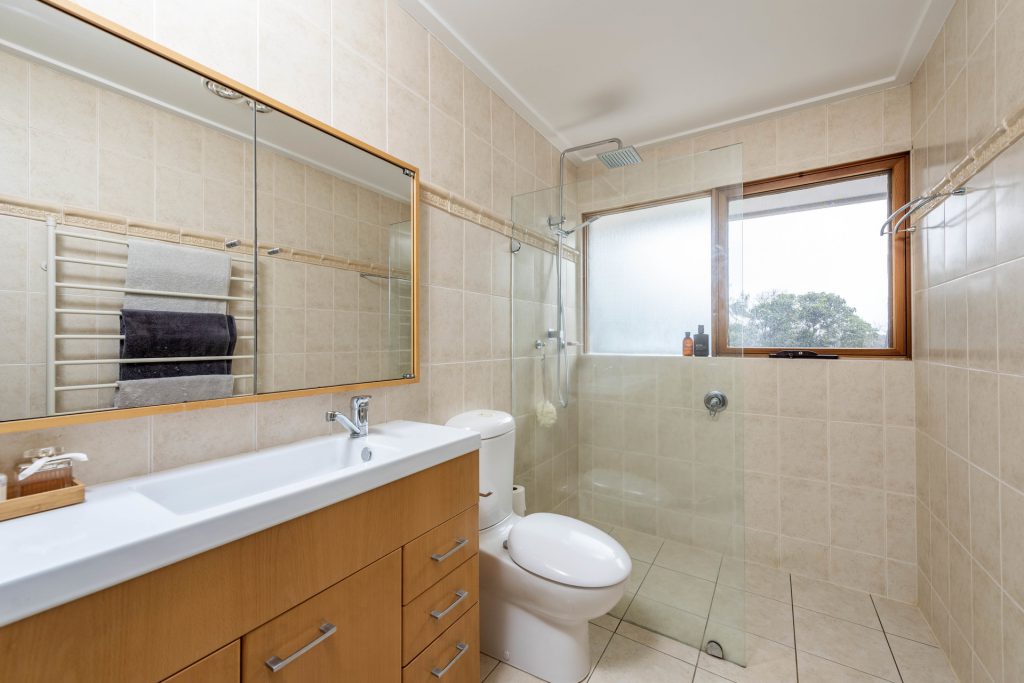 Upstairs bathroom with large heated towel rail – flat entry shower.