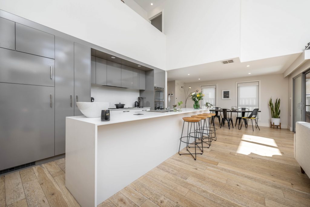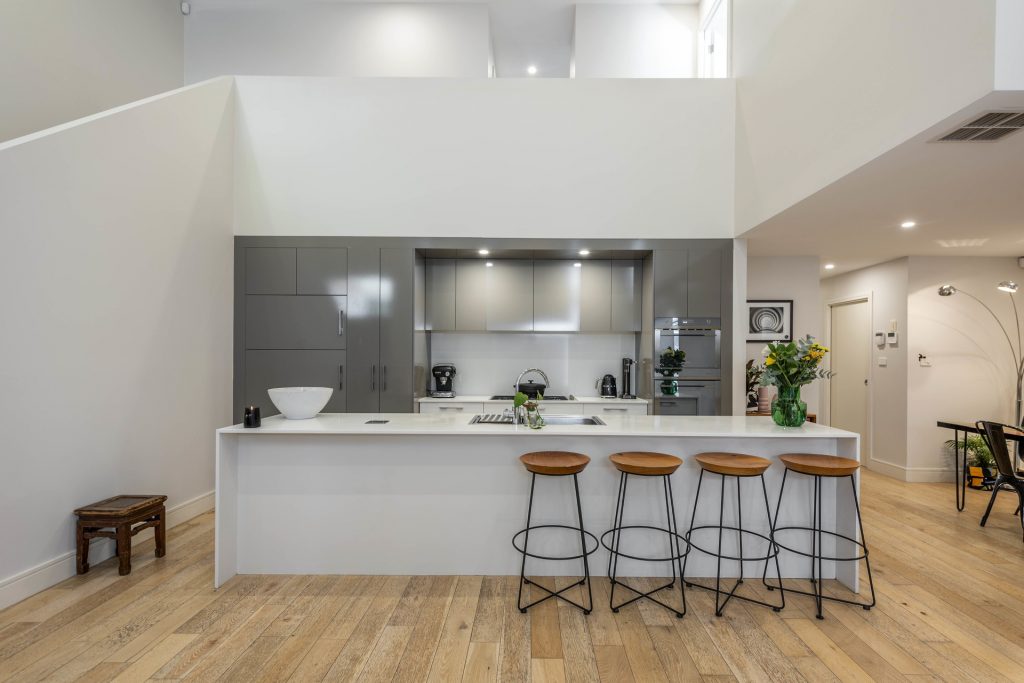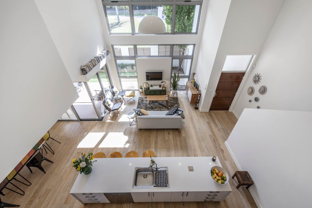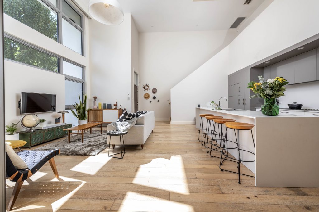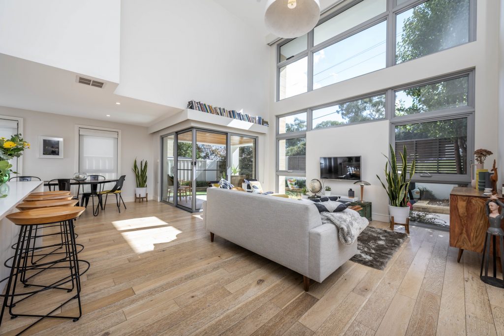 – Light-filled open plan living room with 5.2m ceilings, floor-to-ceiling windows and designer pendant light
