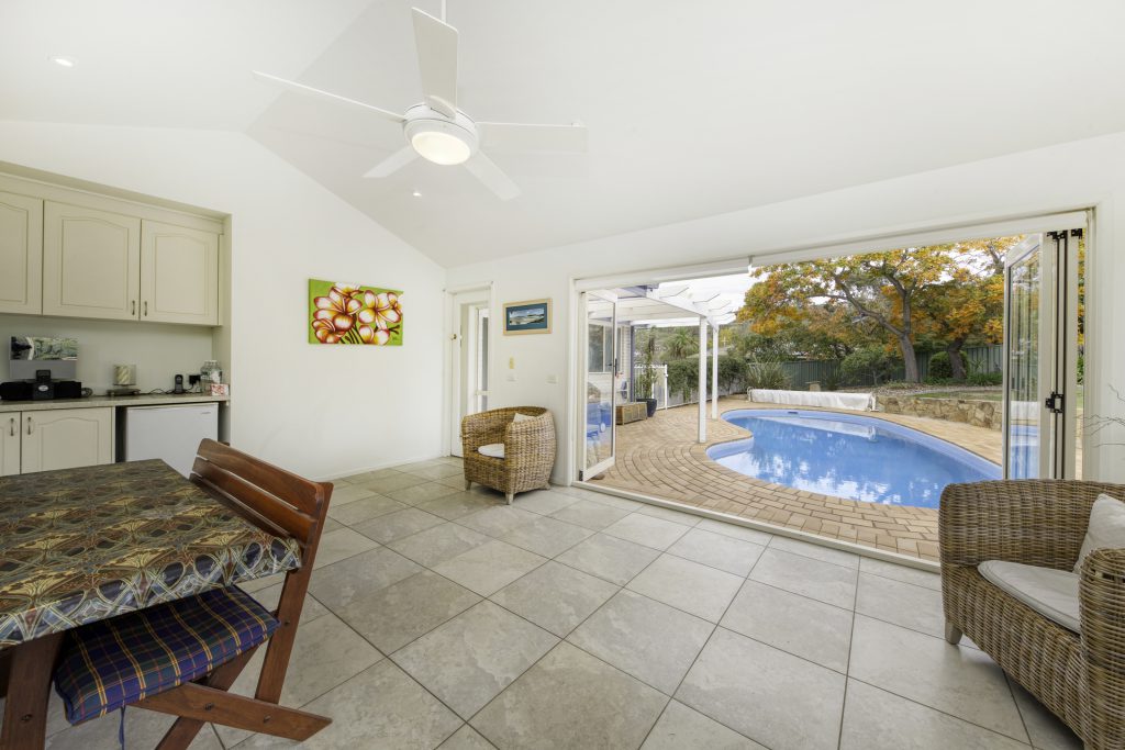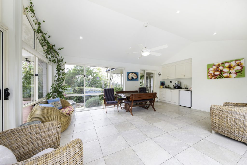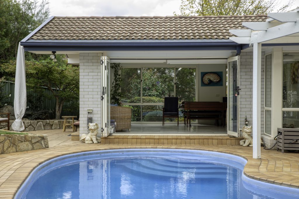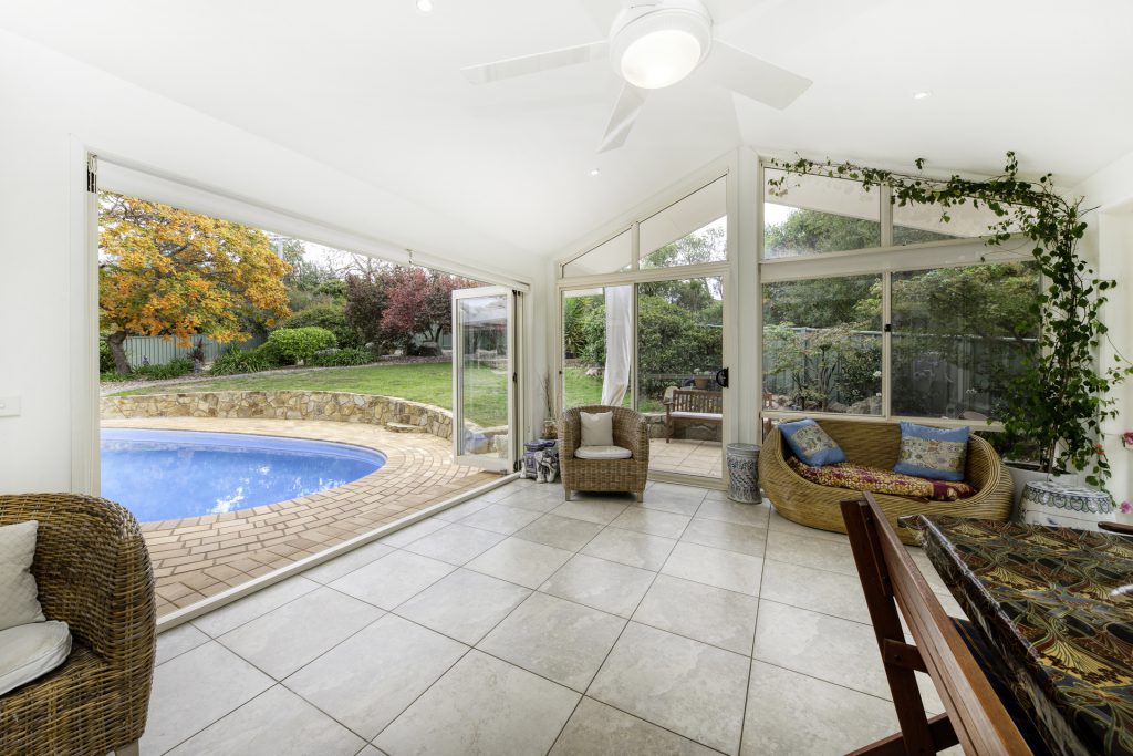 The well appointed kitchen connects seamlessly with the tiled family room and meals area which flows directly to the outdoor tiled deck that overlooks one section of the rear gardens. The real surprise comes when you enter the fully enclosed sun-room that opens through bi-fold doors to the stunning in-ground pool.