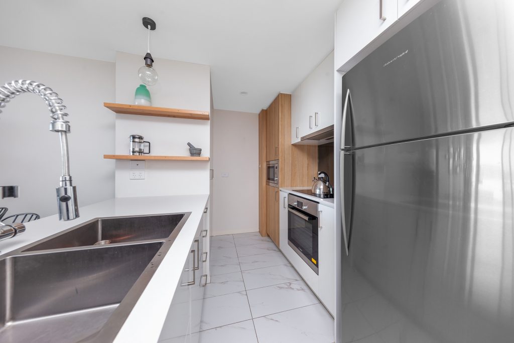 The apartment offers light filled open plan living that open to the large balcony on one side and connects to the modern kitchen with stone waterfall bench tops, pendant lighting and dishwasher on the other.