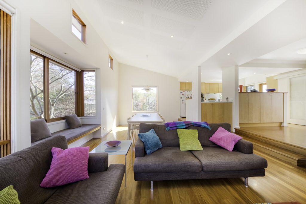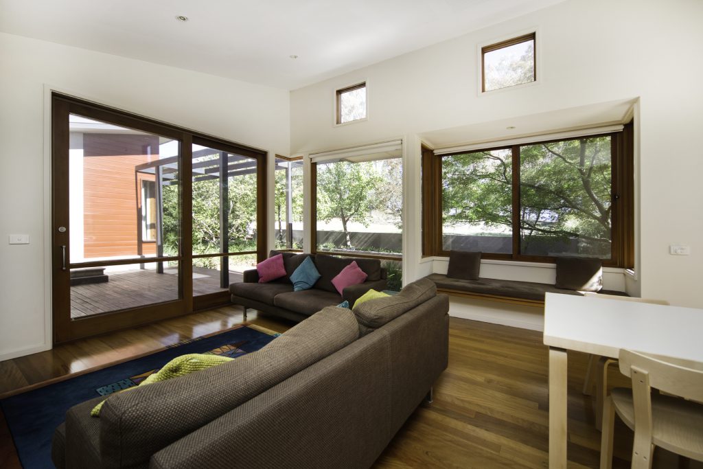 Window seat in living area captures the winter sun and is a great place to settle down with a book while in summer it is shaded by the mature Japanese Maple tree