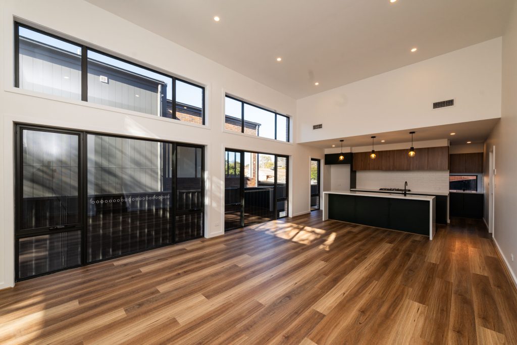 As you step inside, you’re greeted by a symphony of natural light cascading through large windows, illuminating the expansive open-plan living areas with extra high ceilings that amplify the sense of grandeur. The main living room flows on to the sunny terrace, which is created for entertaining in comfort all year round, while also being low maintenance. The timber floors add warmth and character, leading you to the stone benchtops that grace the contemporary kitchen, a culinary haven for the home chef. To elevate the kitchen experience, you also have access to an extra large walk in pantry at the rear of the kitchen.