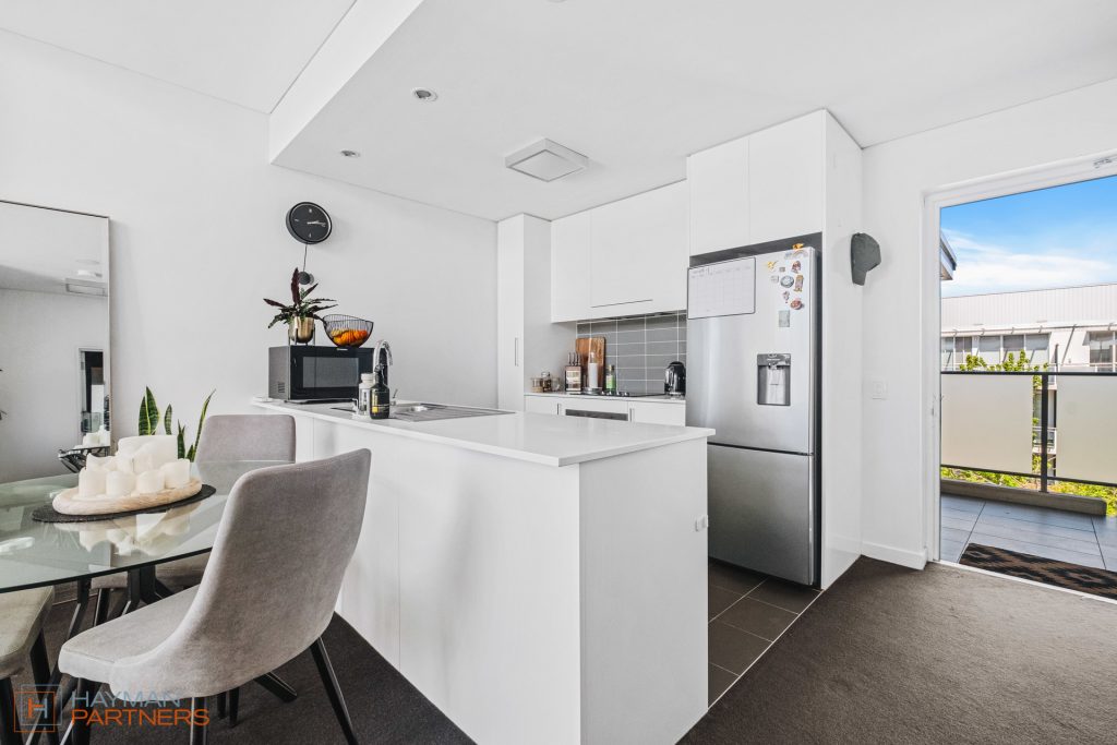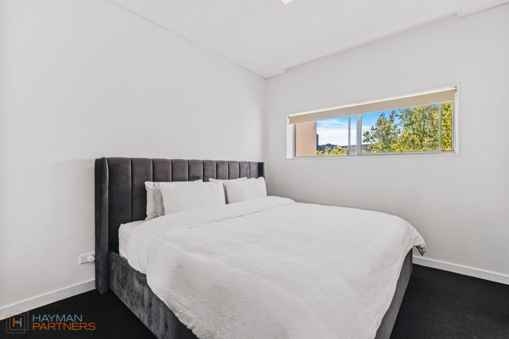 The spacious kitchen is complete with an island stone benchtop, sleek stainless-steel appliances, and a tiled splashback. Overlooking the kitchen is the light-filled living and dining space, which is elevated due to the high ceilings and large sliding window doors. Flowing from the living area is the north-facing balcony, offering an ideal setting for relaxing or entertaining in the fresh air. From the living room, you look out onto the green treetops of Phillip.