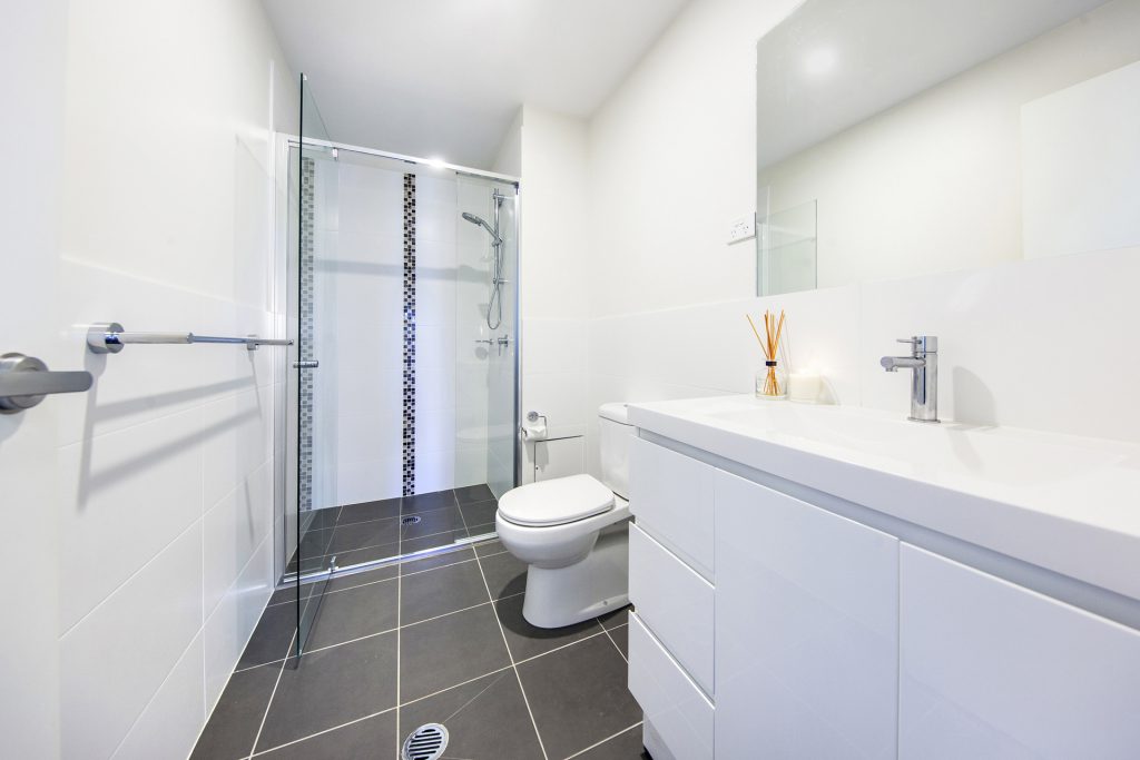 Wooden floors in living spaces, tiled bathrooms and carpet in bedrooms