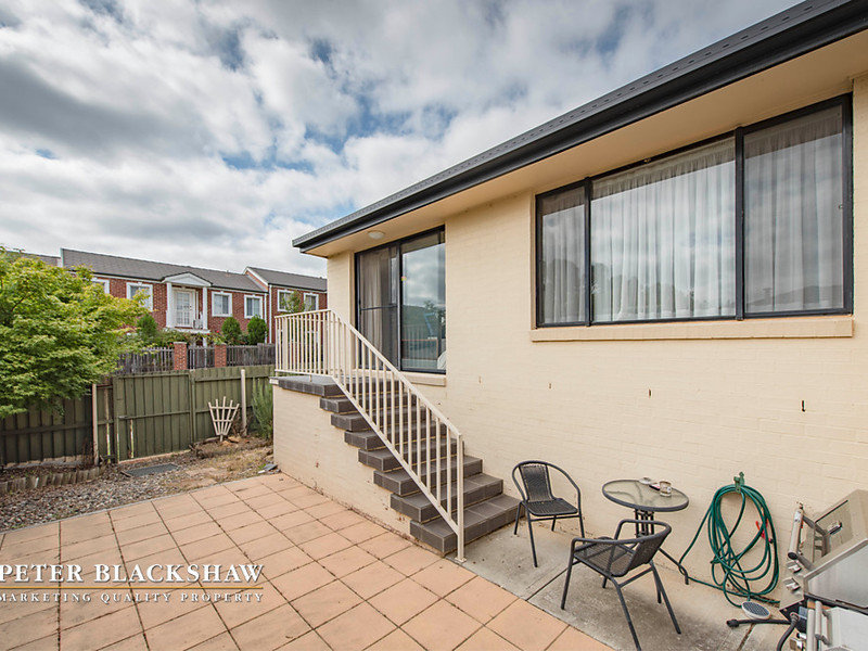 An outstanding opportunity now exists for you to secure a single level townhouse superbly situated at the end of a quiet boutique complex within this sought after Cul de sac of Bruce. This single level townhouse offers two spacious bedrooms both with built in robe and the master with access to the large, two way bathroom. The functional open plan design includes a functional kitchen with quality appliances that opens to the sun drenched lounge and dining area. Landscaped gardens surround the large paved north facing outdoor courtyard, which is fantastic for entertaining and also has access to green belt adjacent. Other features include ducted gas heating, internal atrium and a double lock up garage with internal access. The location within minutes to Belconnen, uni’s, hospital and AIS makes this stunning townhouse an ideal live in or investment opportunity.