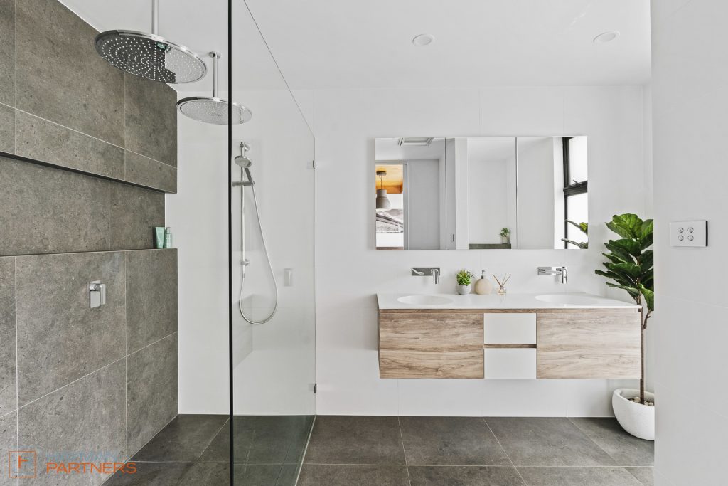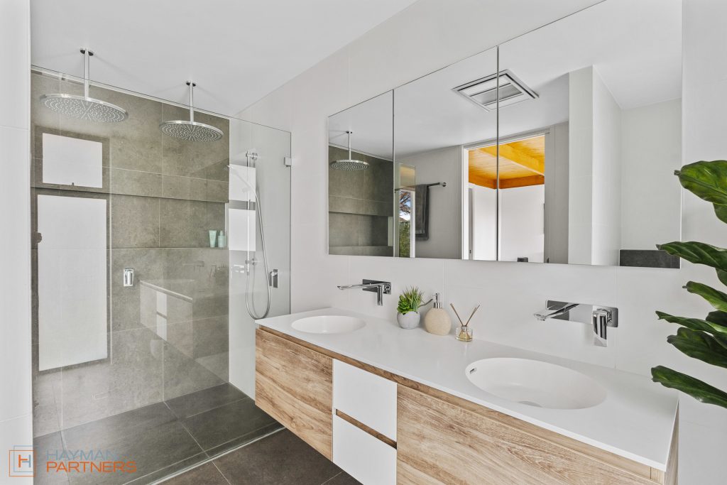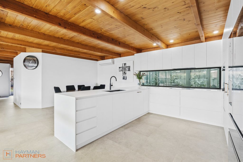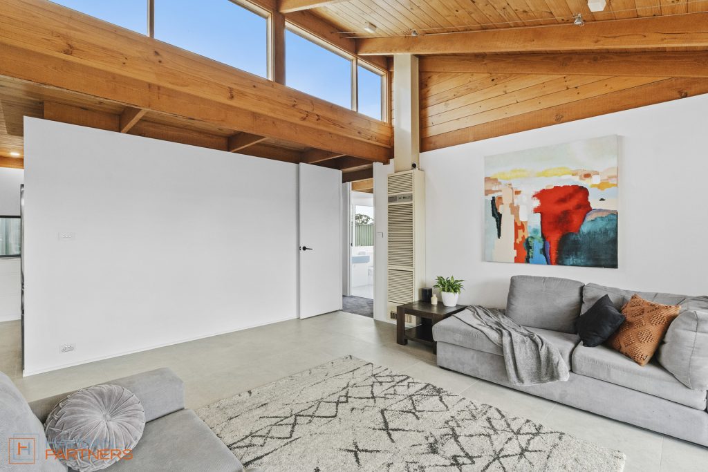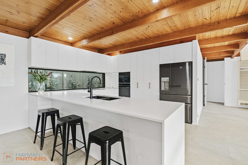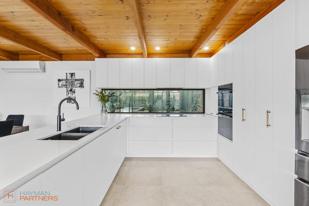The living rooms of the home are a real highlight, with architectural features such as full-length windows, vaulted ceilings, and a north-facing aspect to allow for natural light to flow in. The space allows for versatility with each living space wrapped around a central garden in the centre of the home.