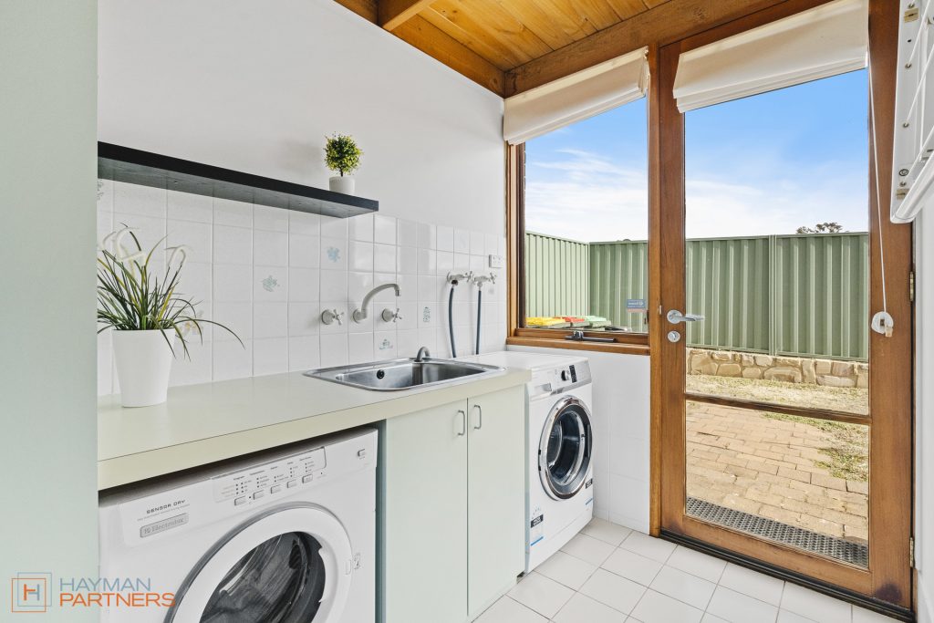 The main bathroom, located at the rear of the home, features a shower/bath combo and a vanity. Additionally, there is a large laundry room that offers plenty of space for additional storage, plus a rear door for direct access to the washing line.