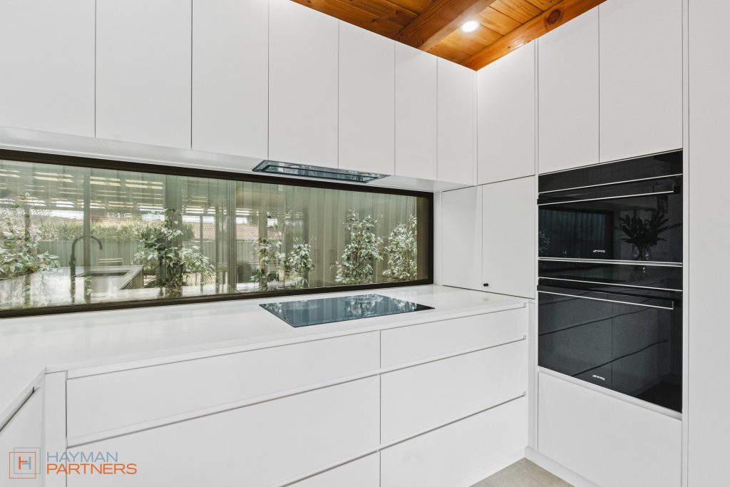 The kitchen has been fully renovated and now features a sleek and stylish finish throughout. The white cabinetry is handleless and includes a variety of drawers and cupboards, as well as a fully integrated AEG dishwasher. Other features include dual sinks, window splashback, induction cooktop, built-in oven and microwave.