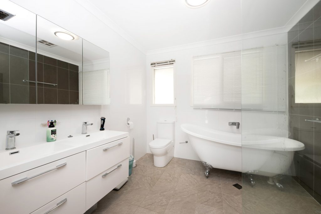 Renovated bathroom with double vanity, freestanding bath, rain-head shower and extra toilet in laundry