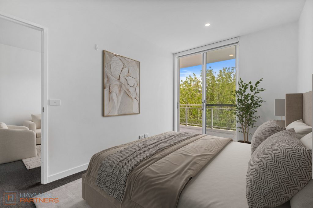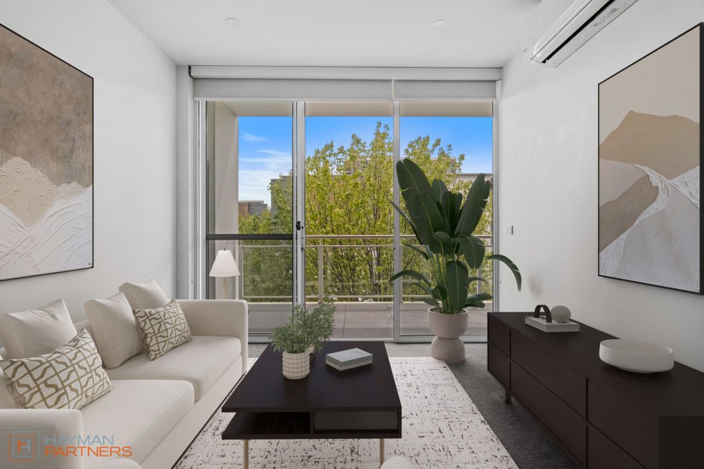 The apartment features an open floor plan that flows seamlessly from the kitchen all the way through to the lounge room, with the entire space elevated by the floor-to-ceiling double glazed windows and north facing aspect, boosting energy efficiency. The balcony is ideal for outdoor dining or entertaining, with an outlook of treetops.