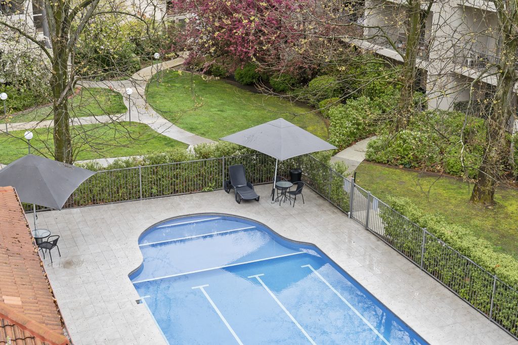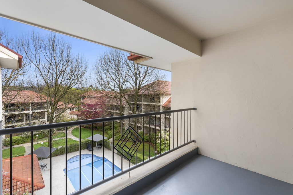 The spacious bedroom features mirrored built-in robes, stylish light fitting, and its own balcony overlooking the pool.