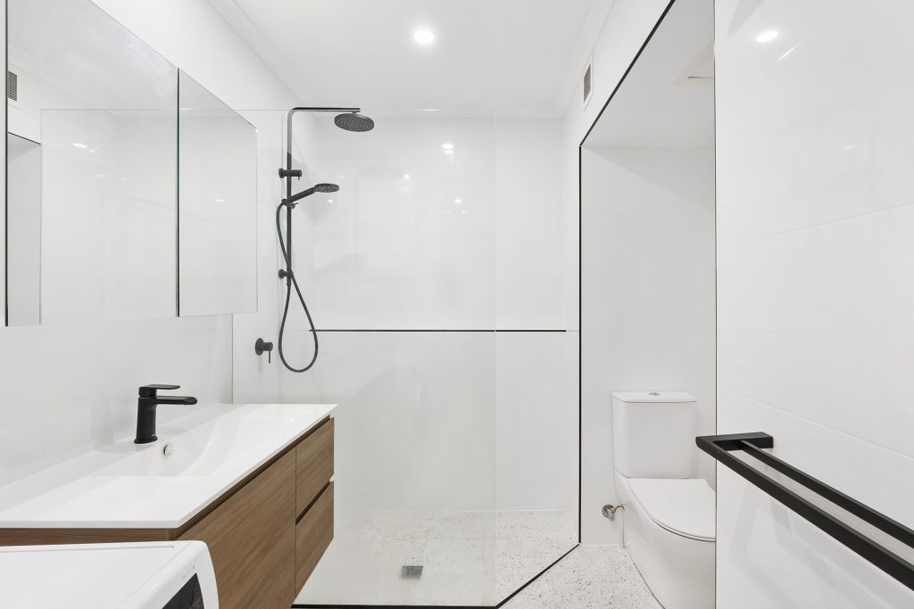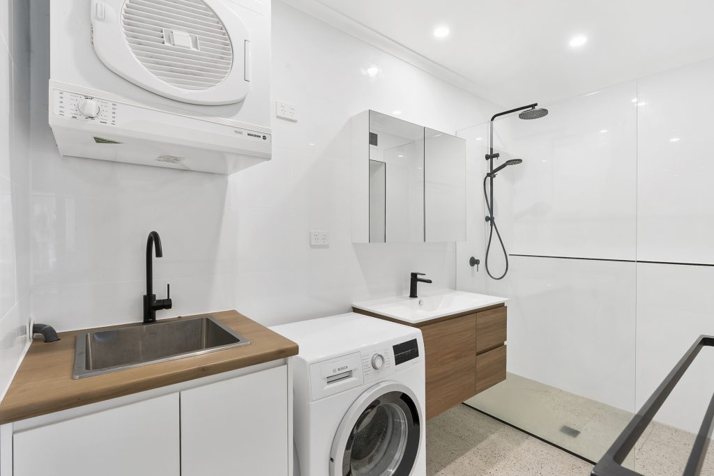 The renovated bathroom is equally impressive, with a wall-mounted vanity and oversized shower. The laundry comes equipped with a separate sink, washing machine and dryer.