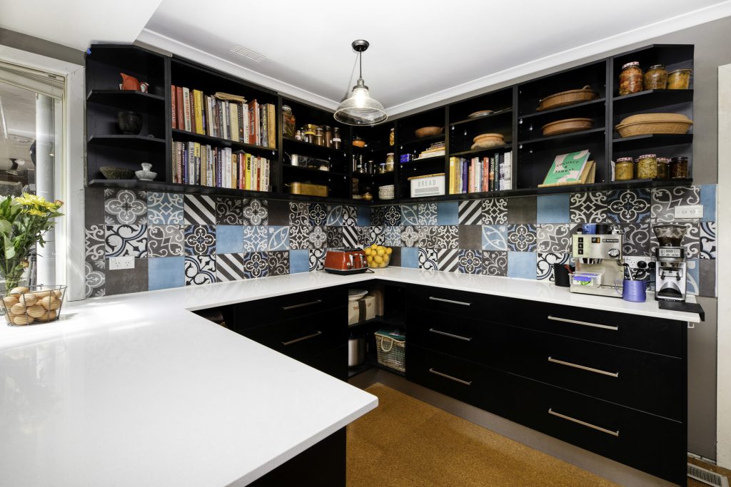 Modern kitchen with stone benchtops, prep / serving area