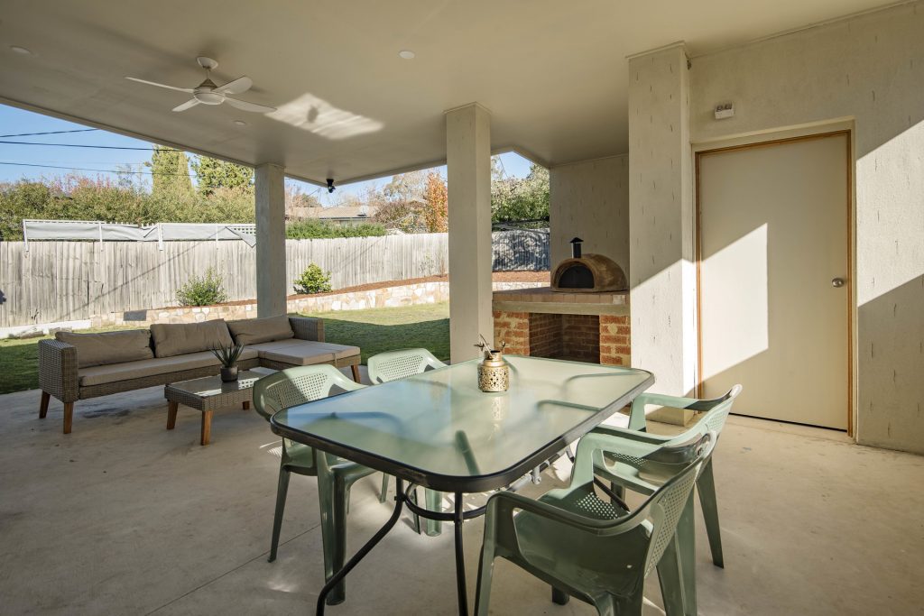 – Large covered alfresco with downlights, ceiling fans, built-in sink and pizza oven