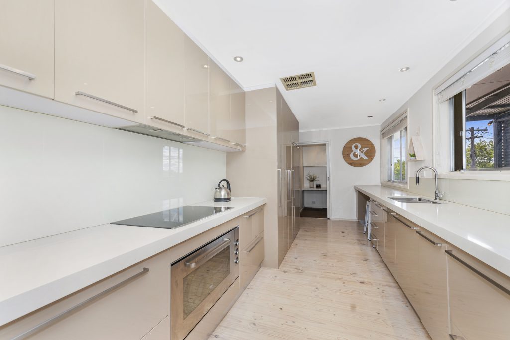 Modern kitchen with stone bench tops and breakfast bar