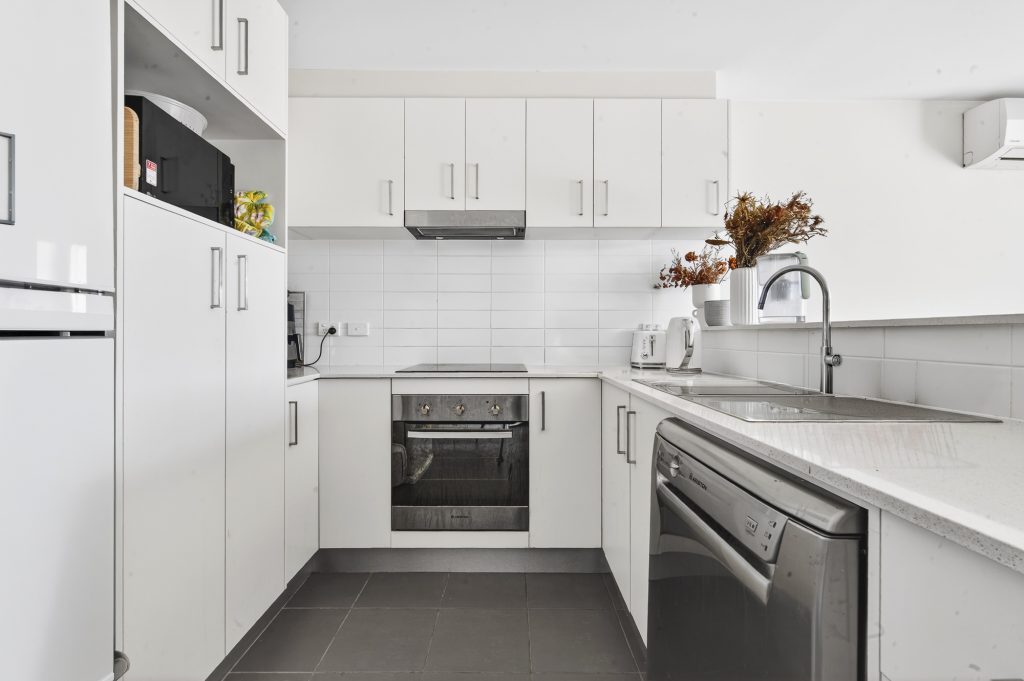 – Kitchen with stone benchtops and stainless steel appliances