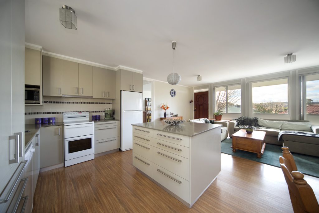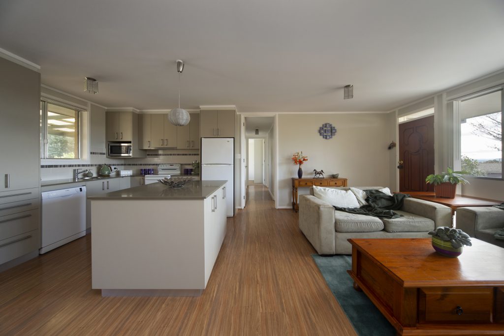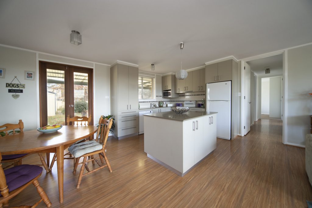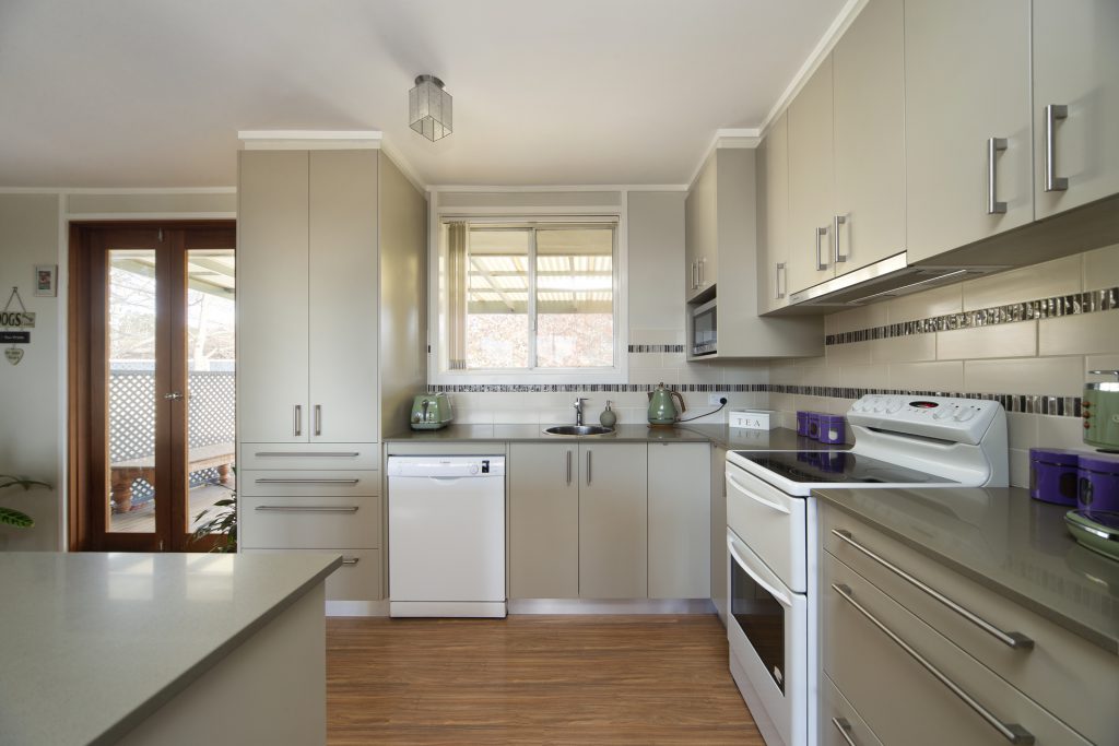 Renovated kitchen with stone benchtops, island bench, Bosch Dishwasher, Westinghouse hotplates & oven.
