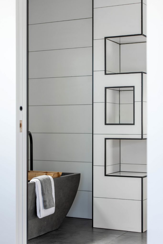 Striking bathroom with floor to ceiling tiles, keeping with the contemporary style of natural wood and stone finishes