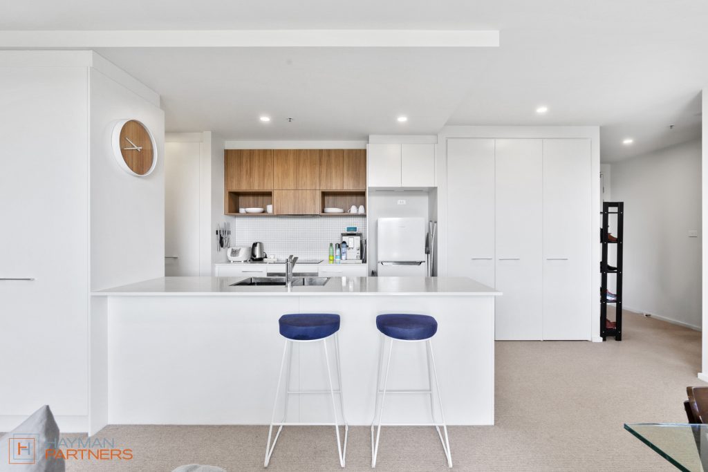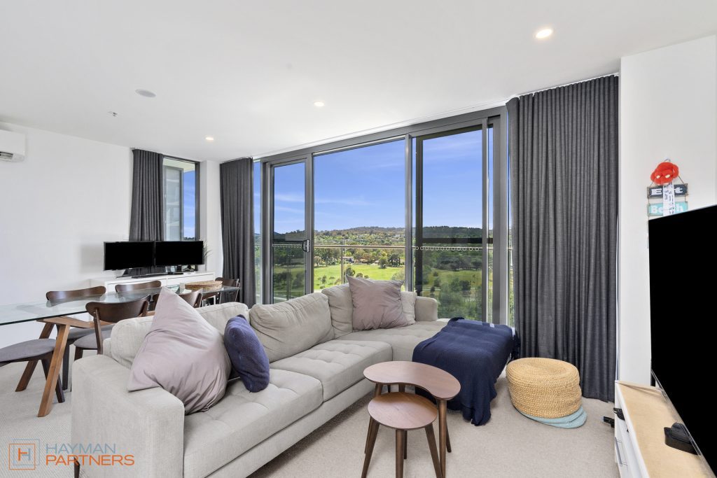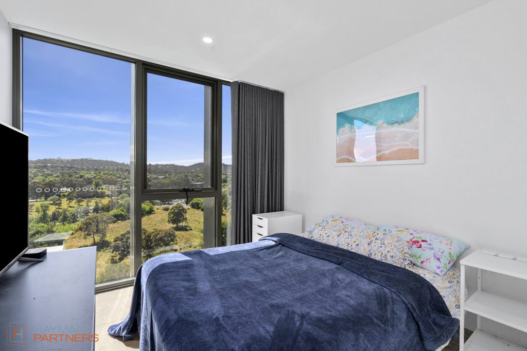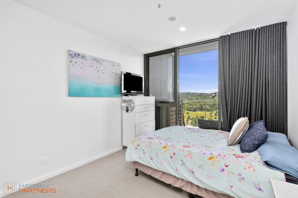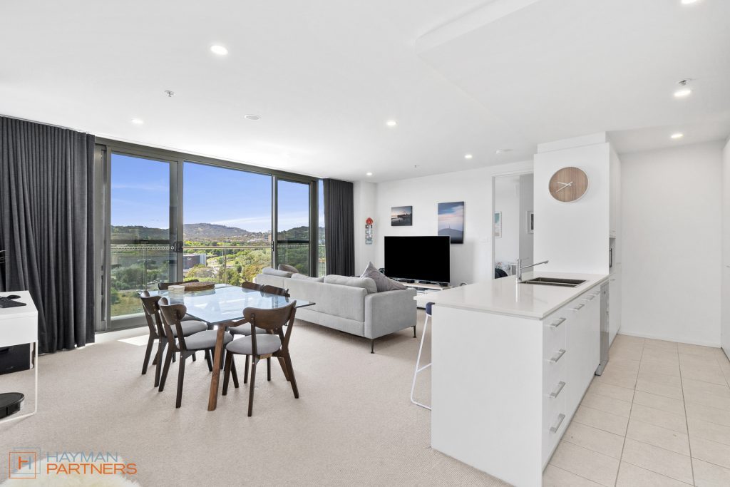 This two bedroom apartment is perched on the 12th floor and enjoys uninterrupted easterly views, sweeping from Black Mountain Tower to Red Hill. With superbly designed clean lines, high energy efficiency, warm neutral colour pallet and quality inclusions – This spectacular apartment will be sure to impress. The impressive floor plan and design in this apartment puts the generously sized living area in between the two bedrooms giving the home a much more open feel as well as much needed separation between the rooms – Perfect for a separate work space, kids room, guest bedroom or ideal rental opportunity.