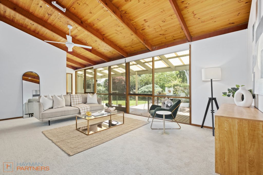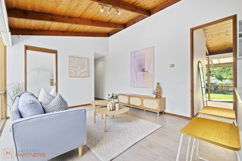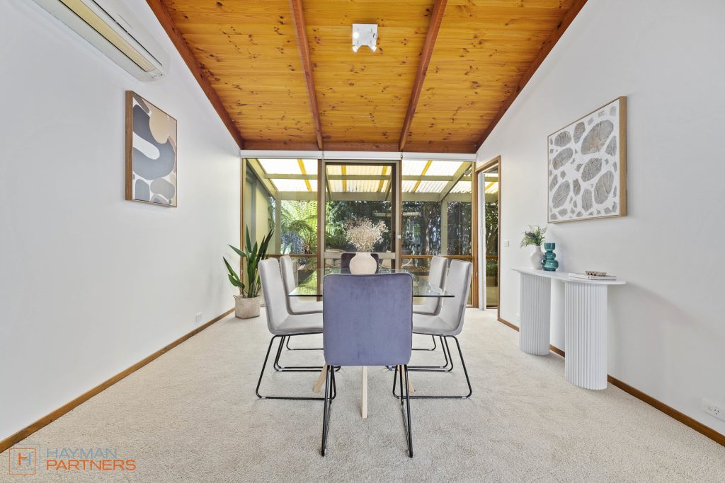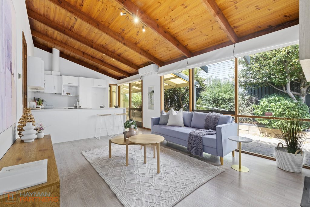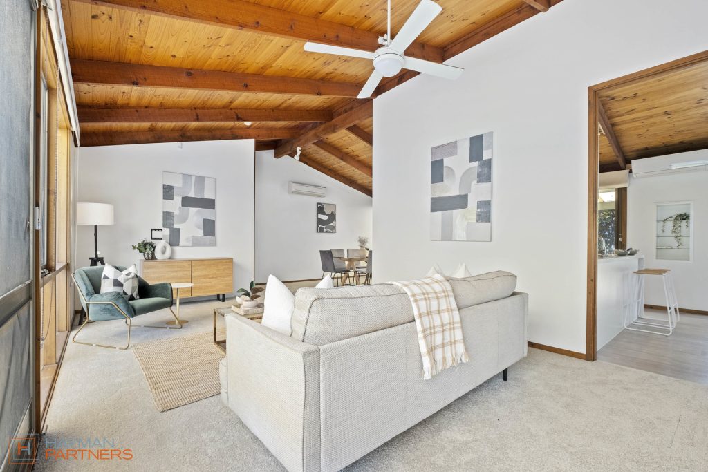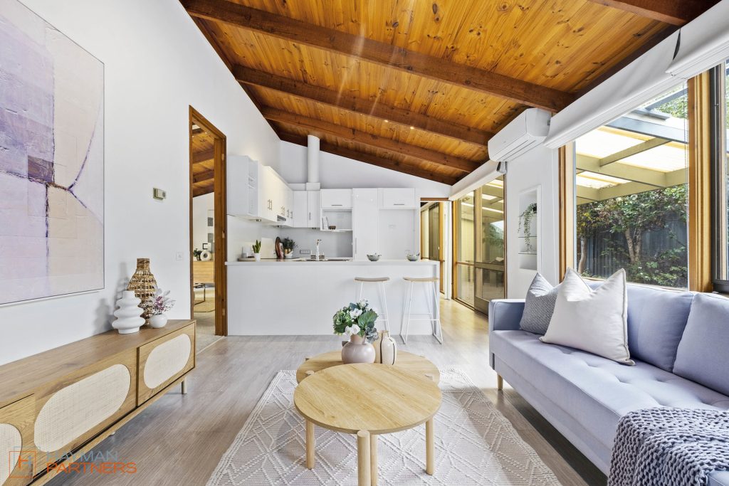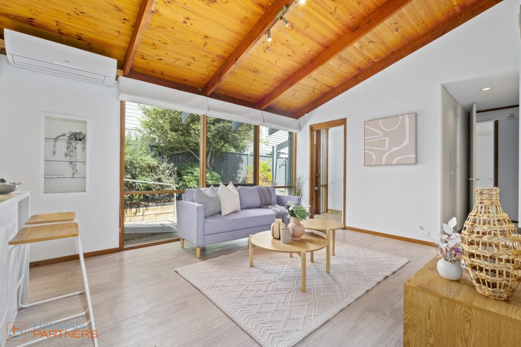 Stylish Single-Level Townhouse in the Heart of Woden. Discover your ideal downsizer in this beautifully designed townhouse, featuring a stunning pitched timber raked ceiling and an abundance of natural light. With three bedrooms, two bathrooms, and a double garage, this home offers the perfect blend of comfort and convenience.