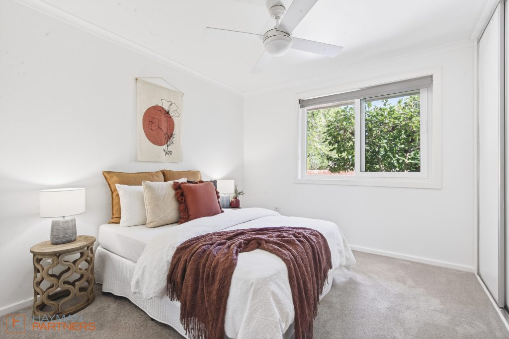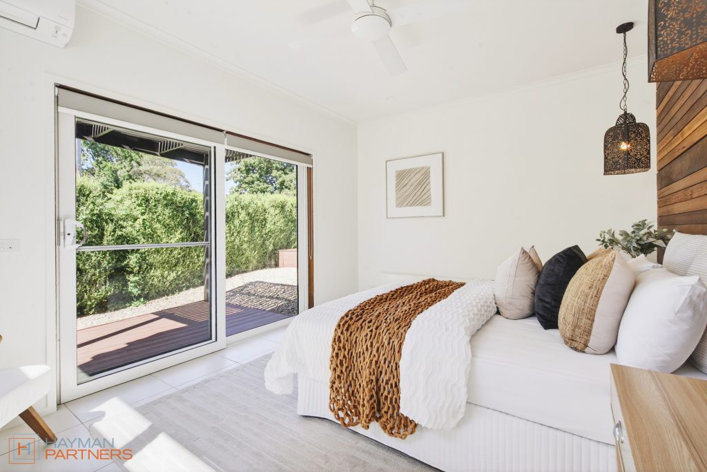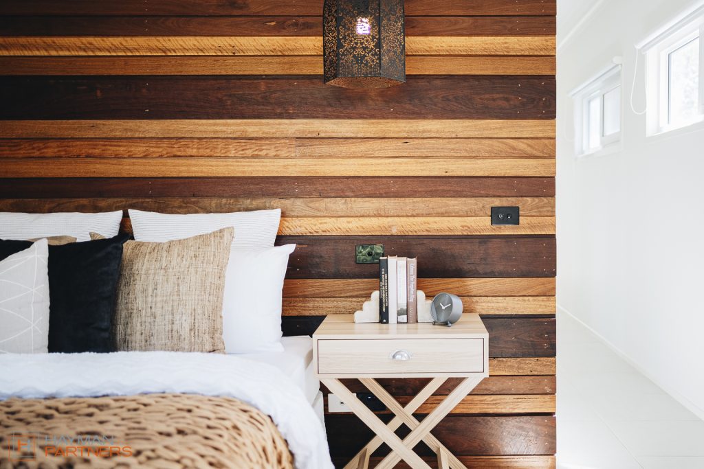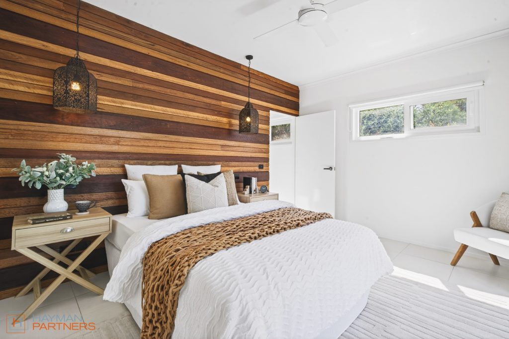 – Private downstairs bedroom retreat with timber feature wall, walk-in robe, ceiling fan, wall heater and timber deck