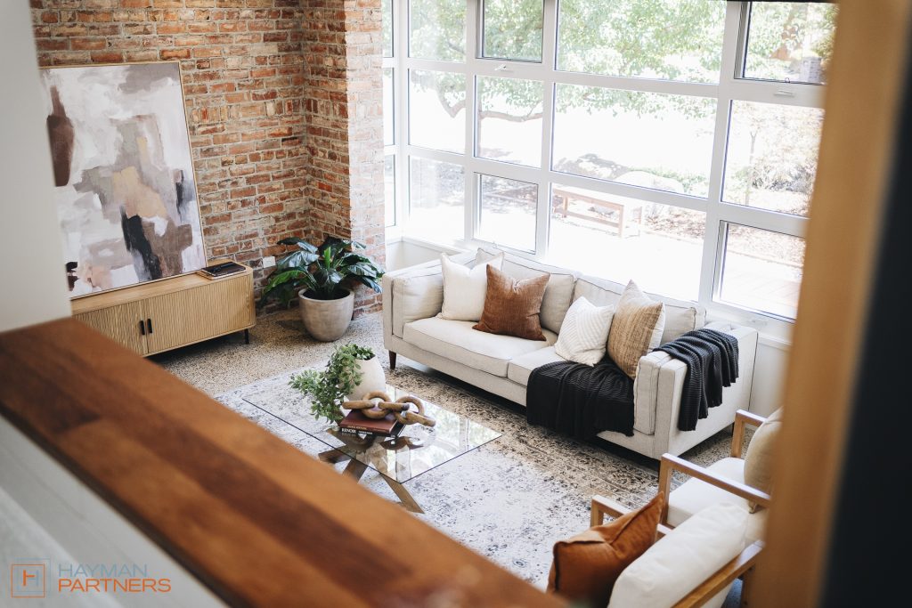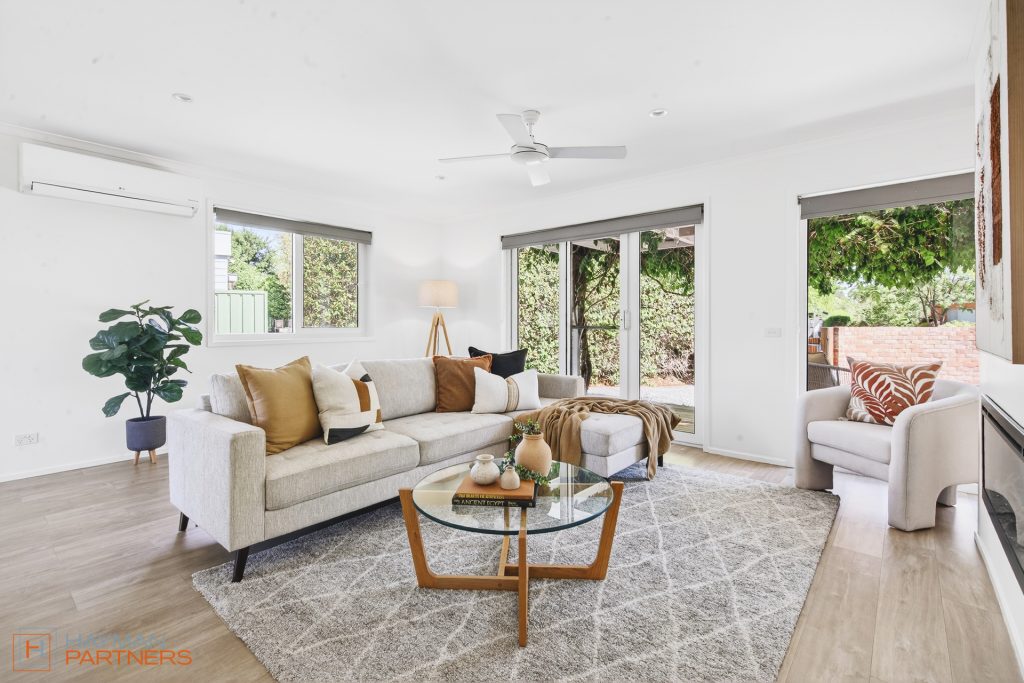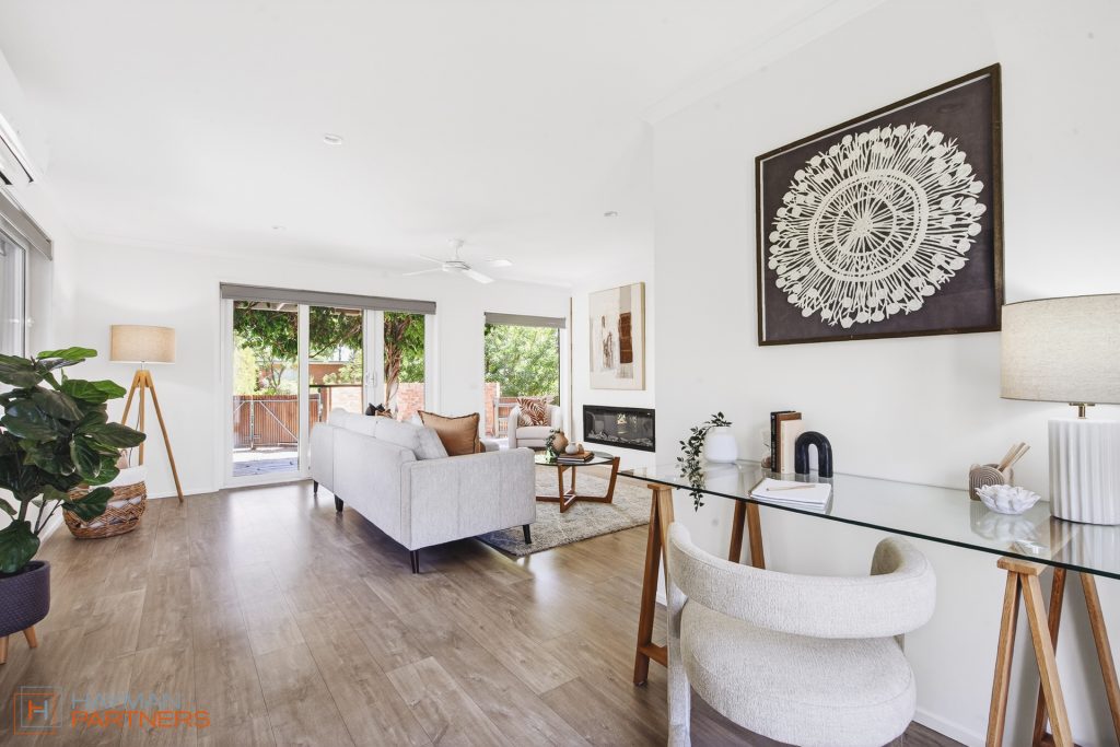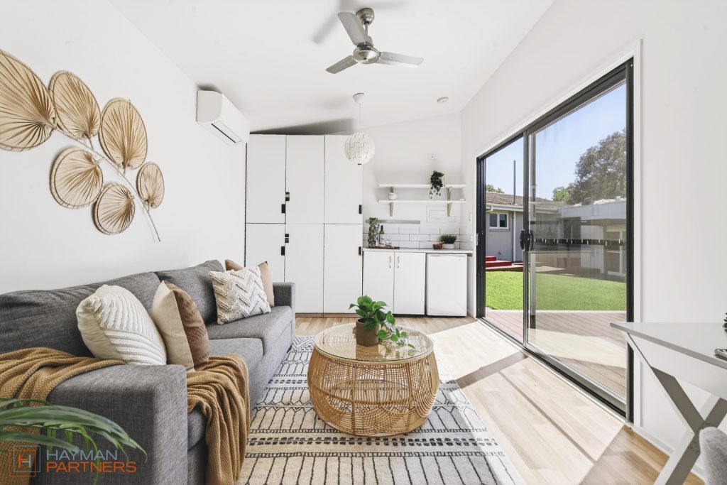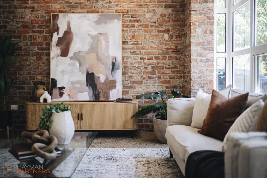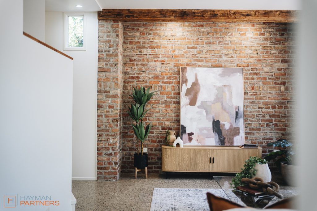 – Light-filled front living area with air-conditioning, polished concrete floors and feature brick wall
