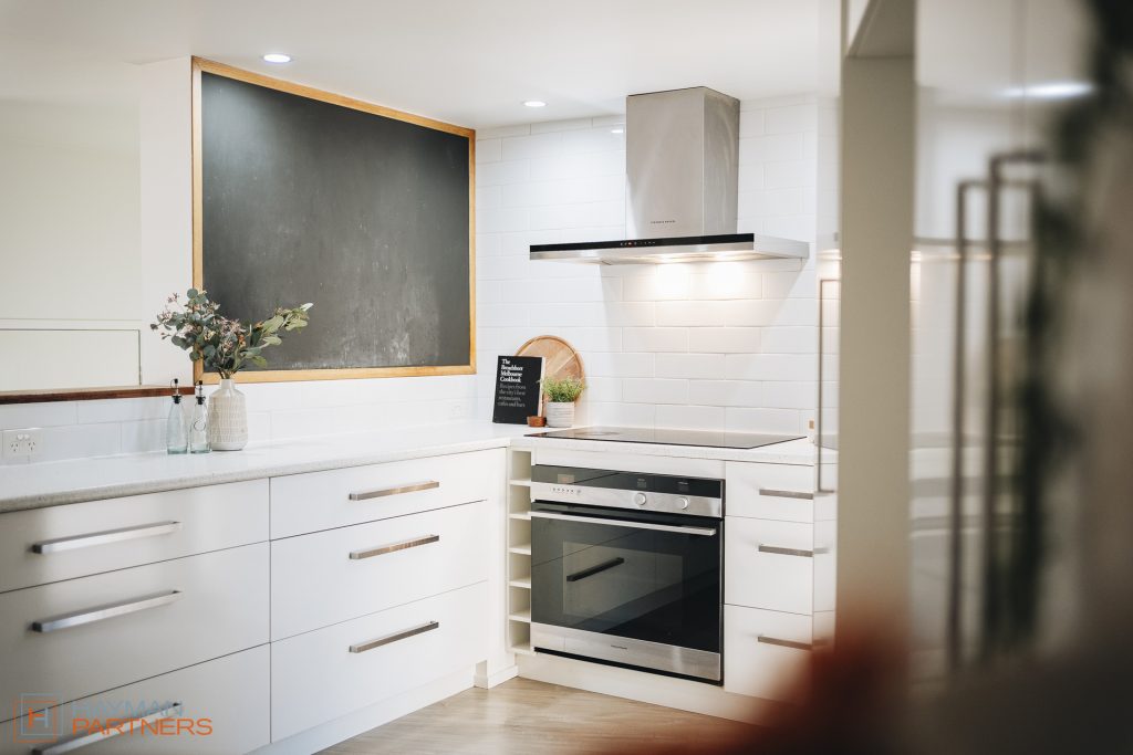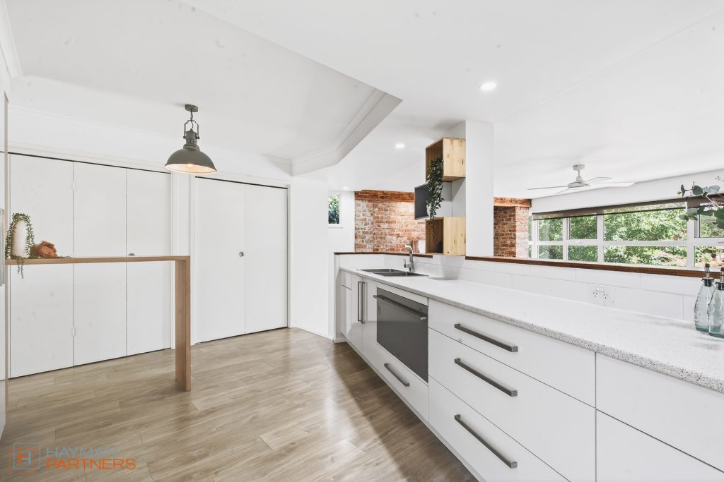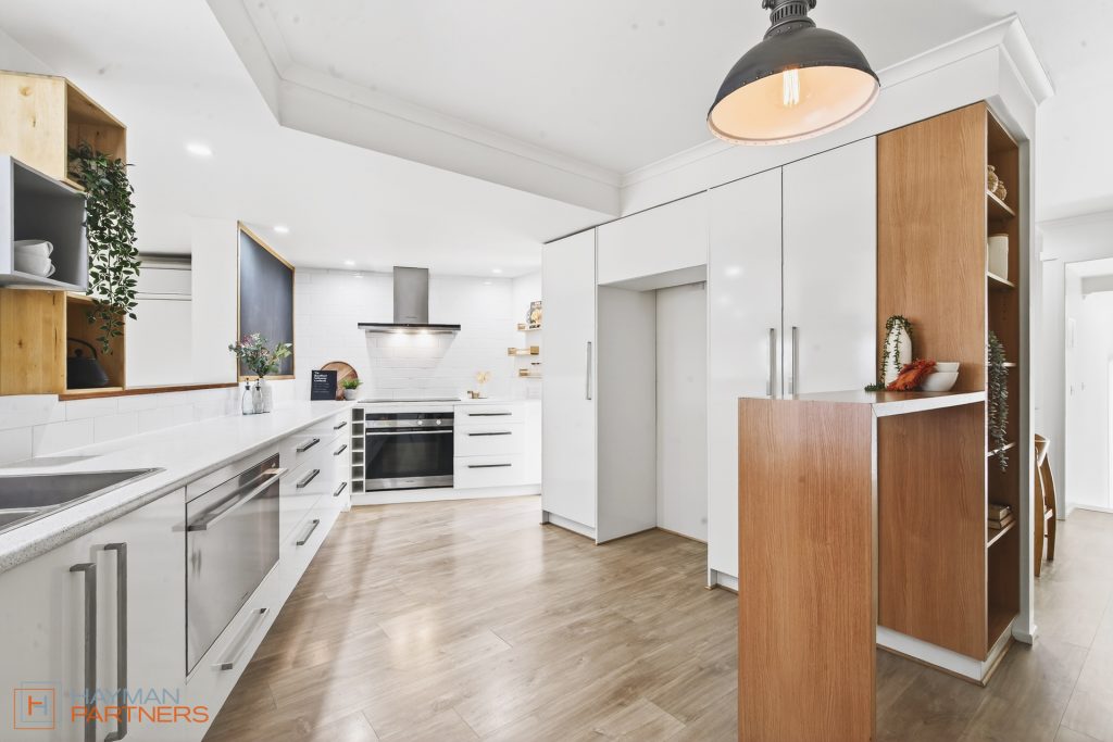 – Elevated kitchen with timber floors, stainless steel appliances, unique fixtures, European laundry and generous storage
