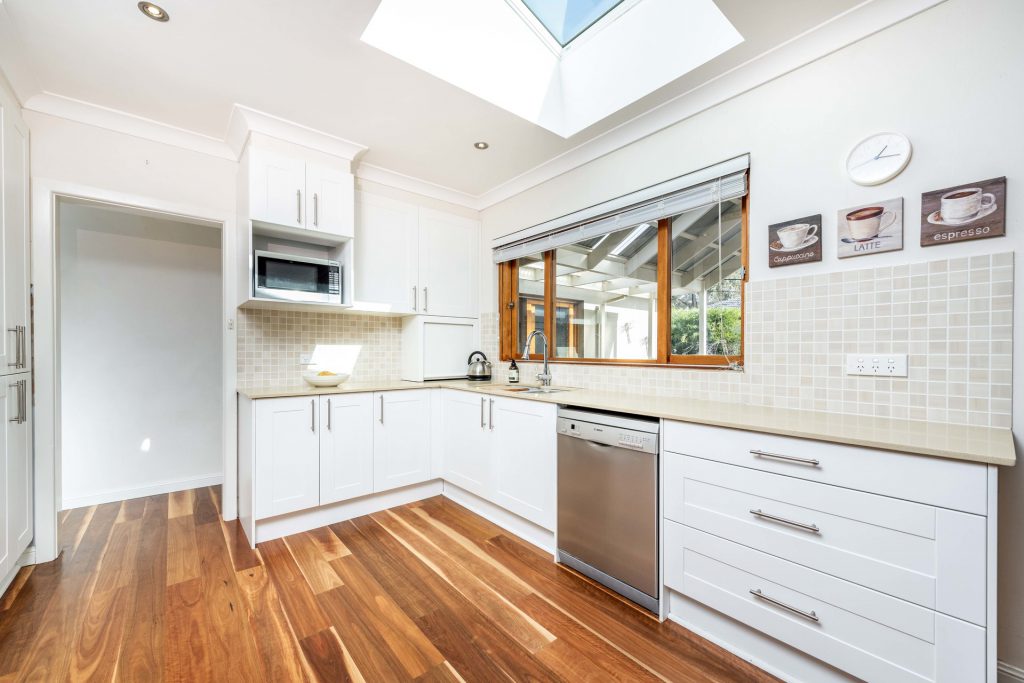 Kitchen features stone bench top and overlooks rear deck and gardens