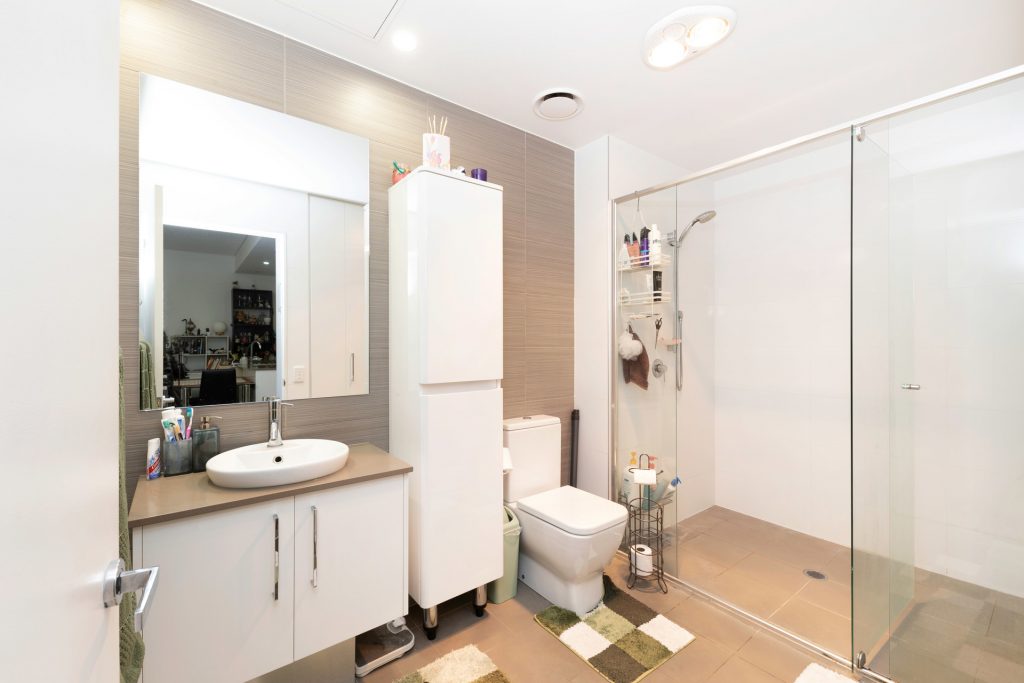 Large main bathroom with modern vanity and large shower.