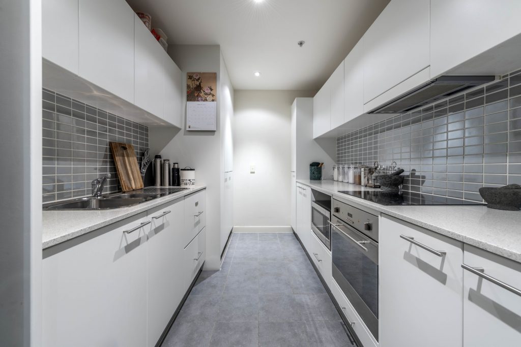 – Kitchen with stone bench top, electric cooktop and ample cupboard space