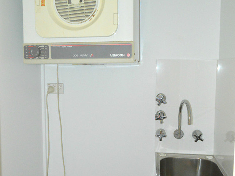 Space saving European style laundry with dryer, clothesline in front courtyard.