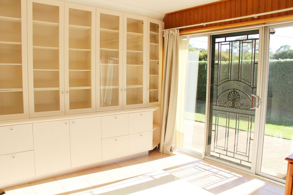 Multi-purpose living room/ third bedroom which includes stylish built-in shelving.