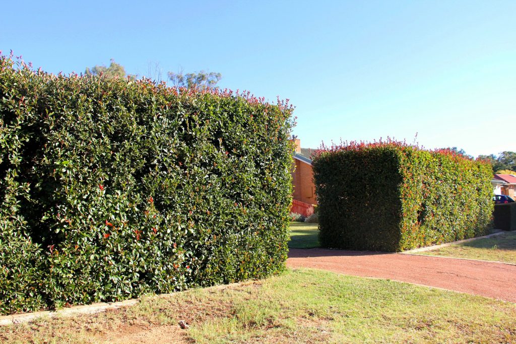 Attractive landscaped front and rear gardens with formal privacy screen hedging and circular driveway.