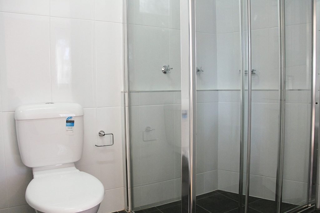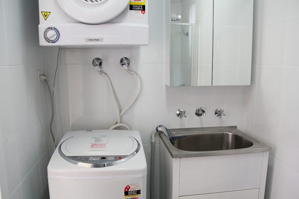 Renovated bathroom includes modern shower, vanity and toilet plus laundry facilities including washing machine and dryer.