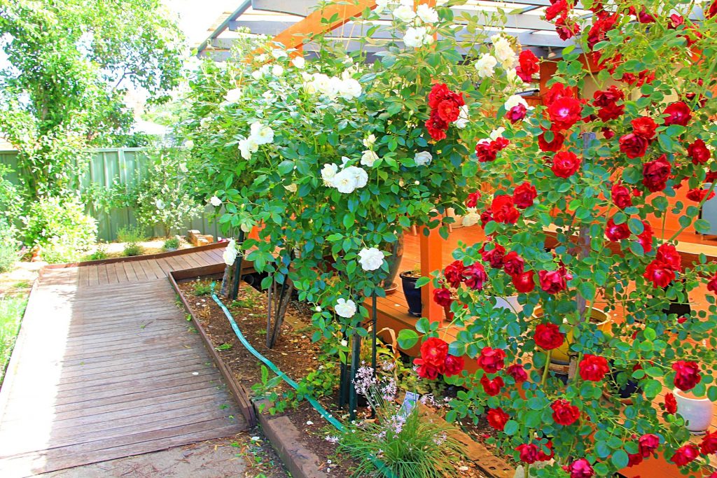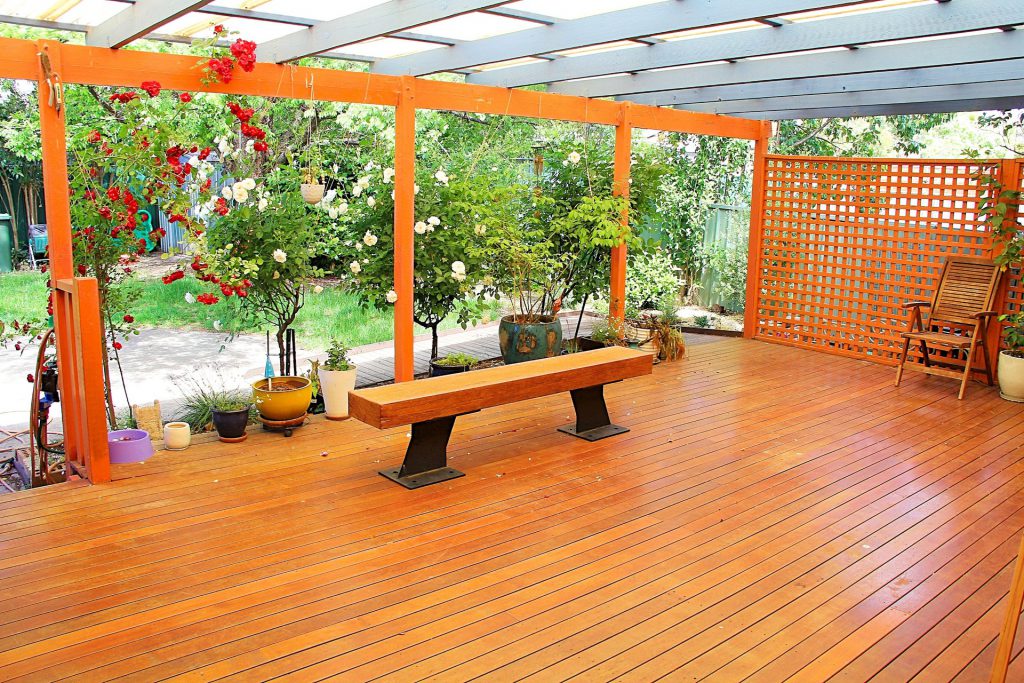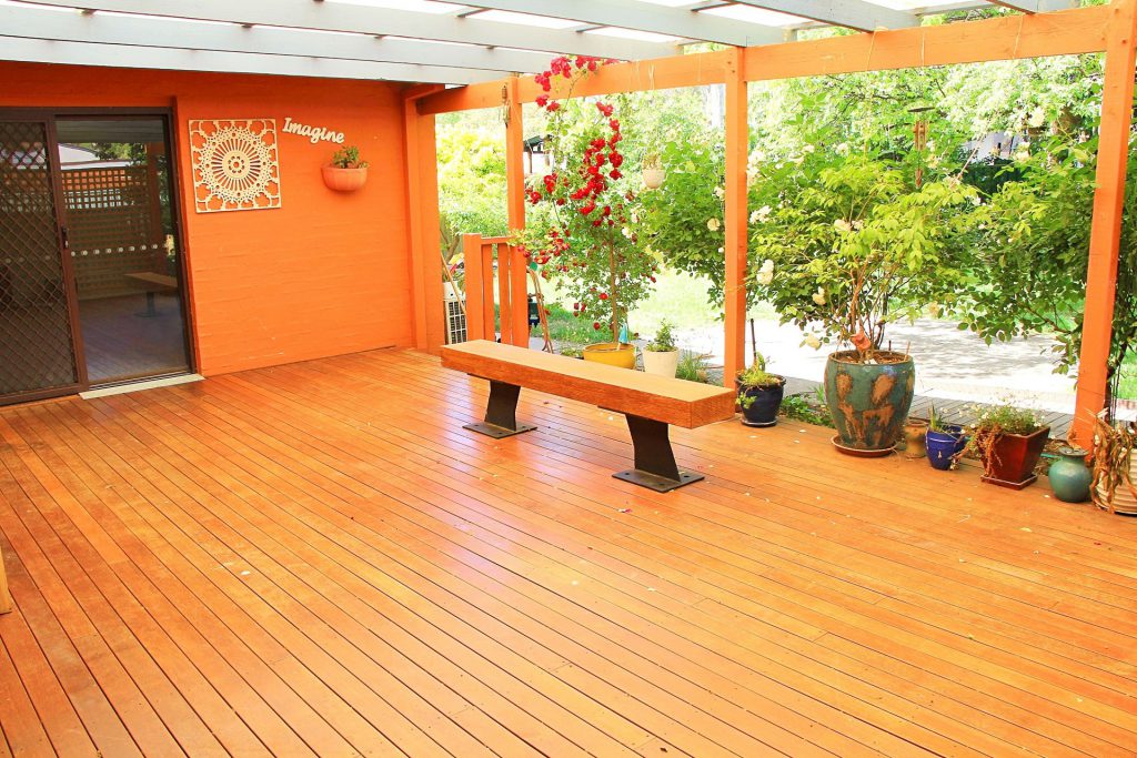 Lovely outdoor undercover deck area surrounded by attractive garden and chicken coop.