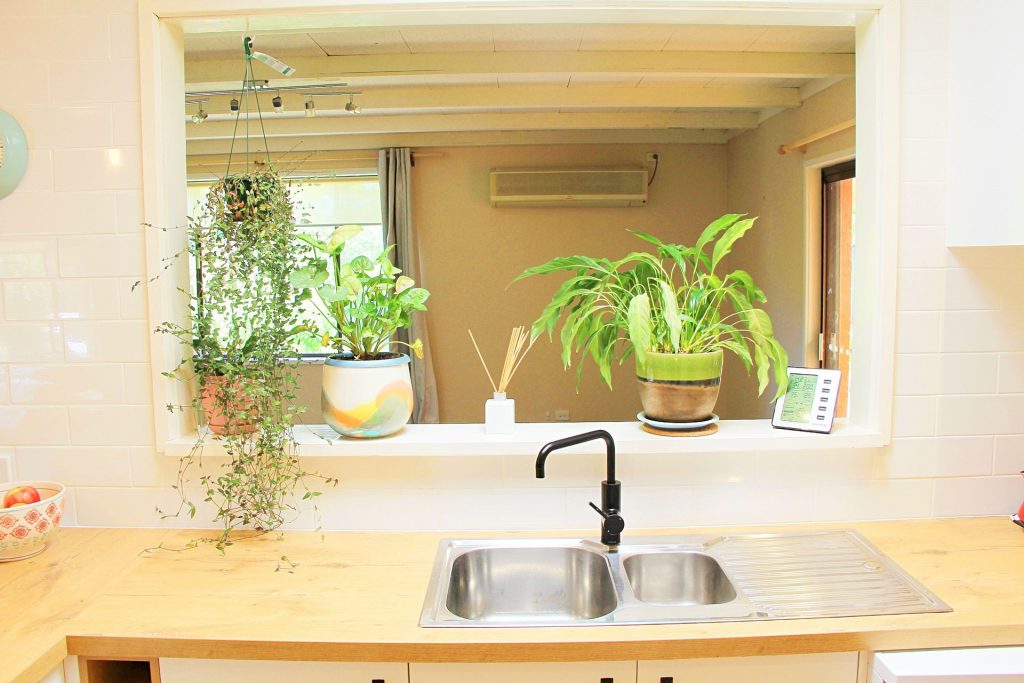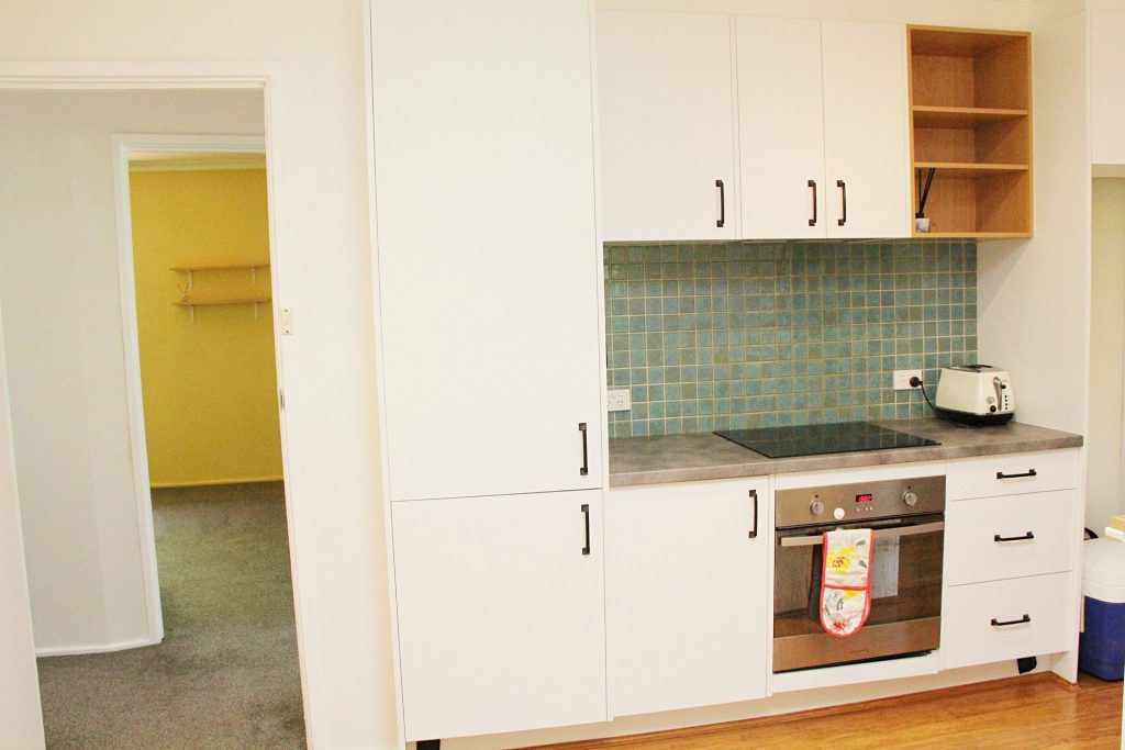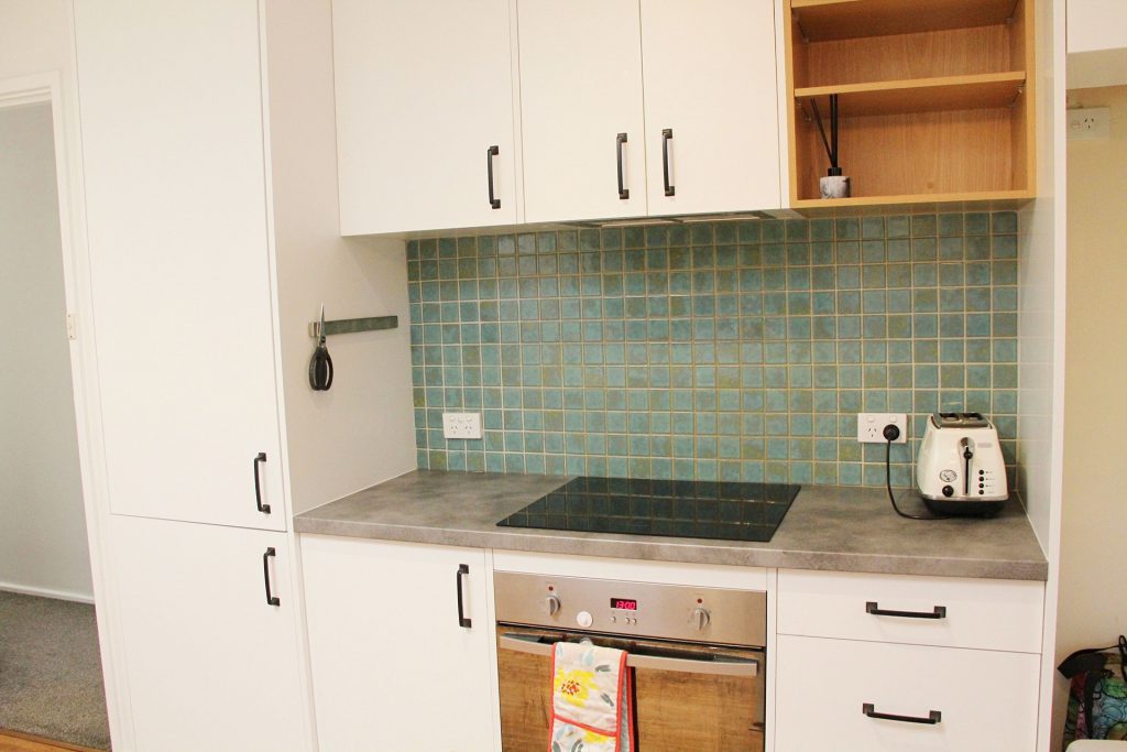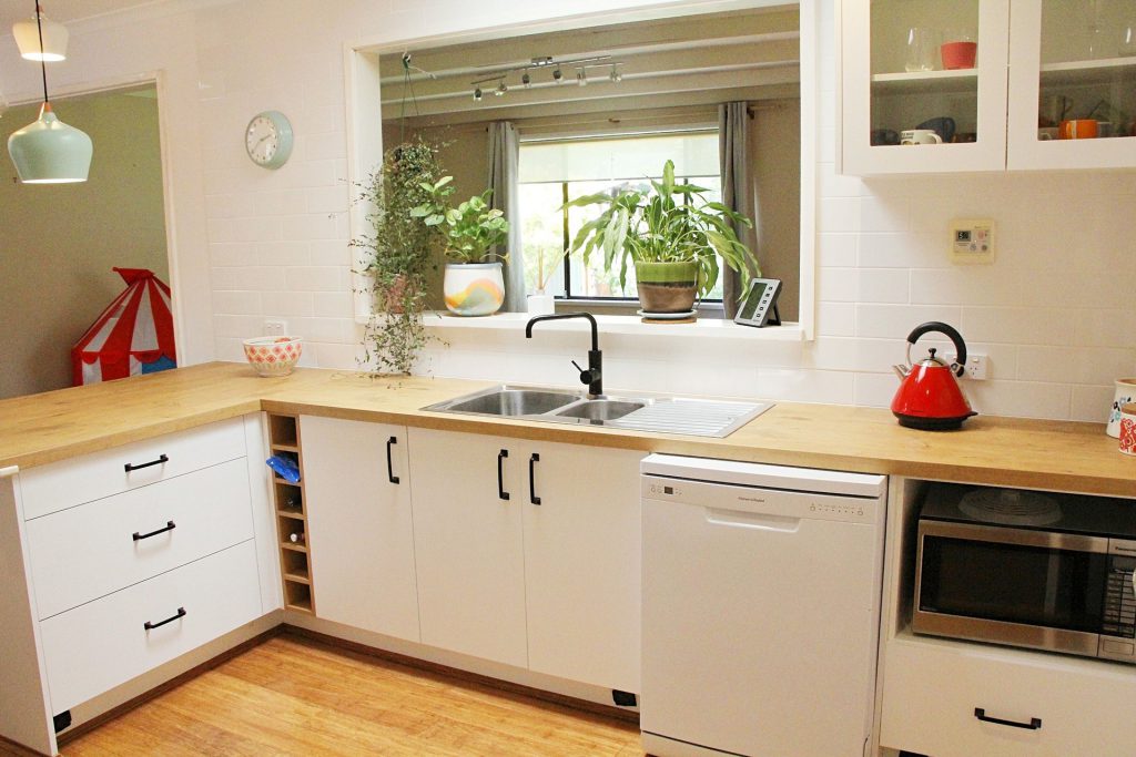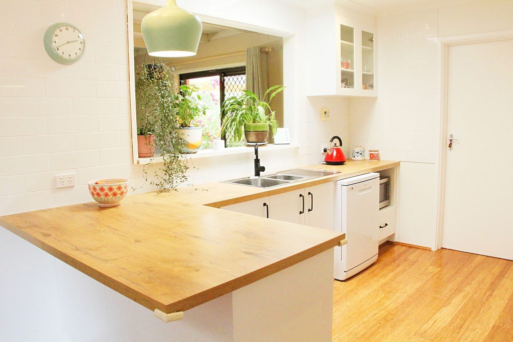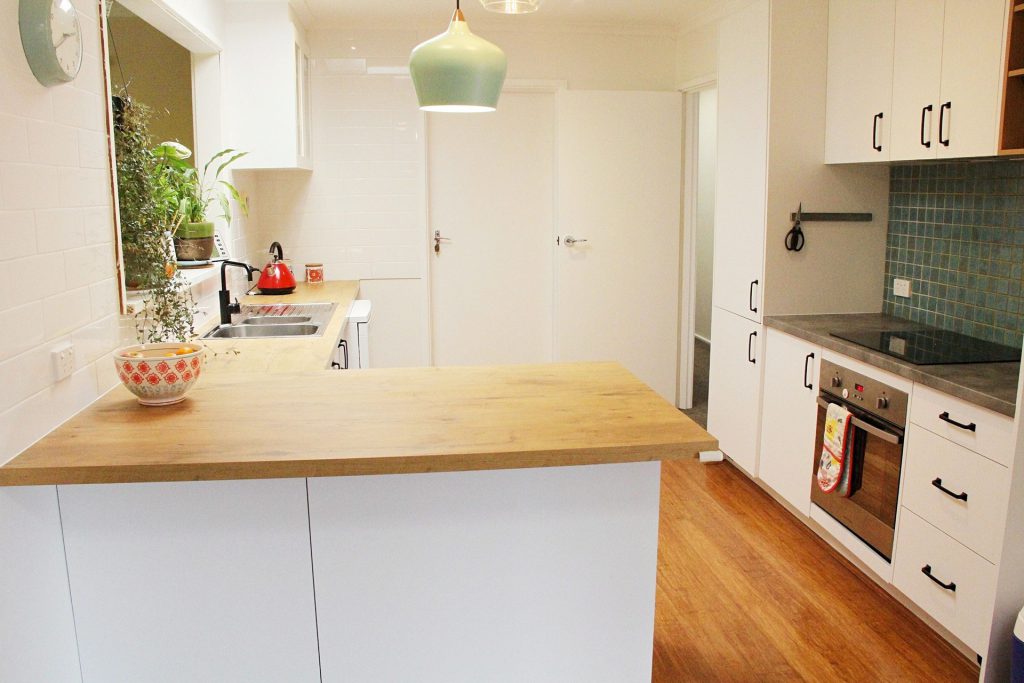 Fully renovated kitchen with timberlook benchtops, black detailing throughout, dishwasher, electric cooking and great storage space.