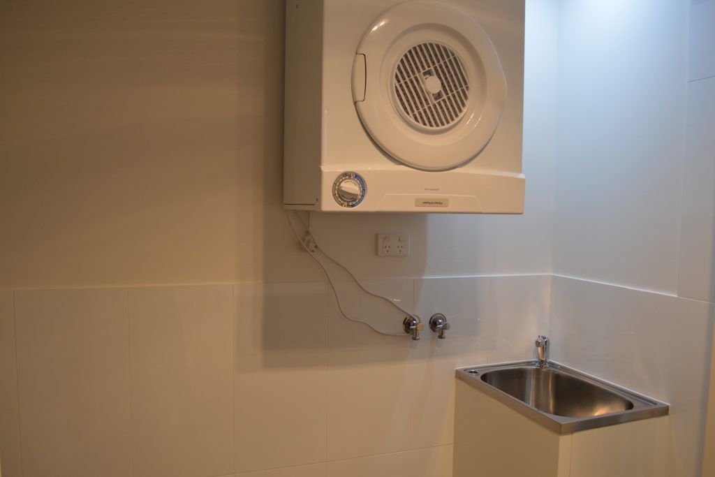 Quality bathroom with modern frameless shower recess, European style laundry with dryer & oversized hamper cavity.